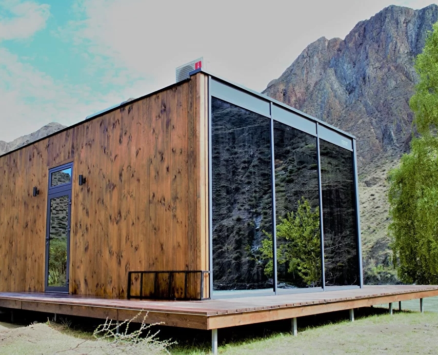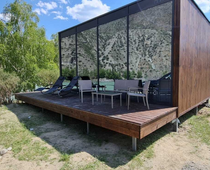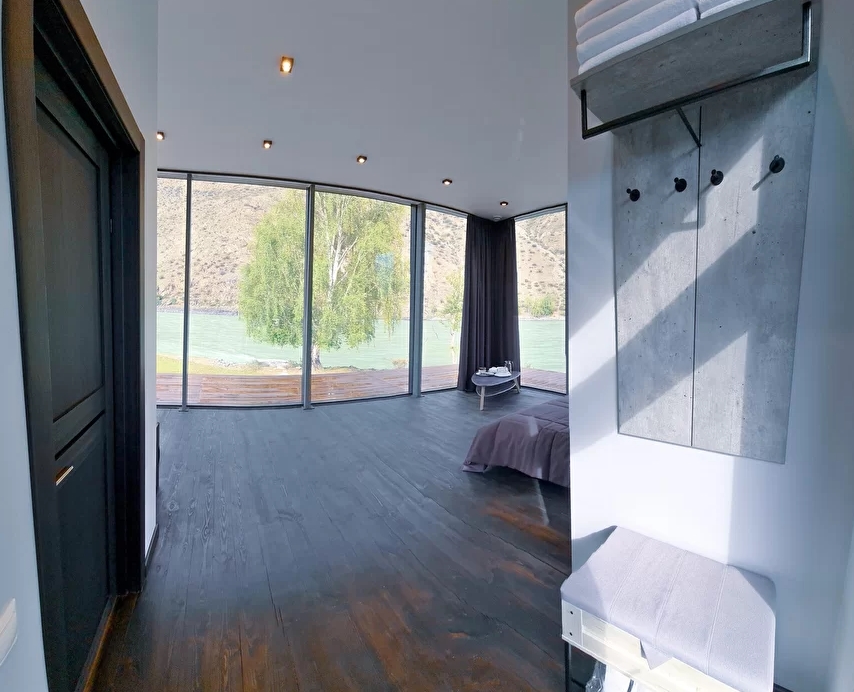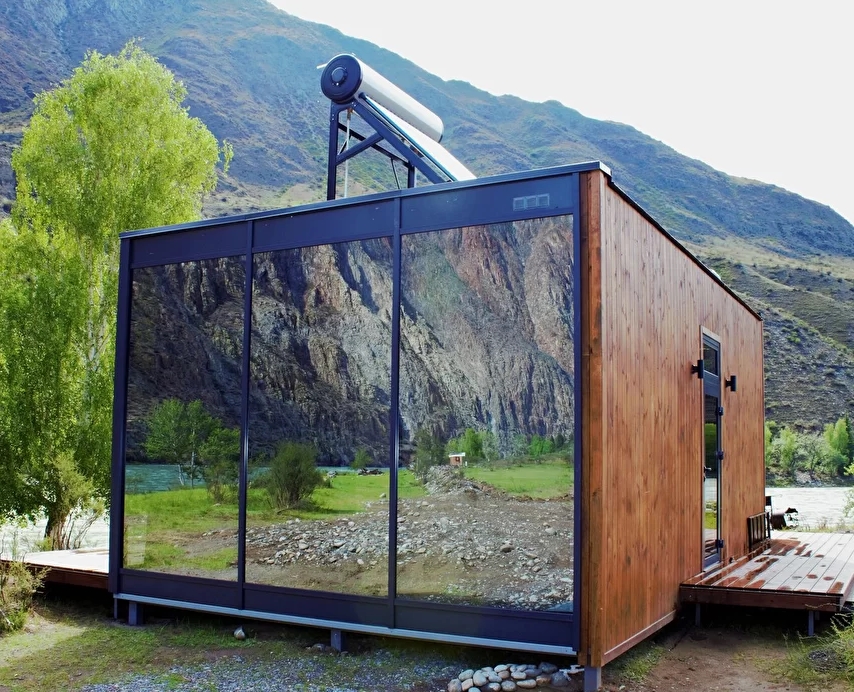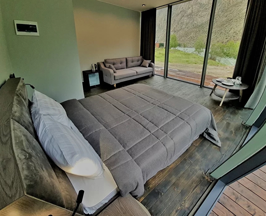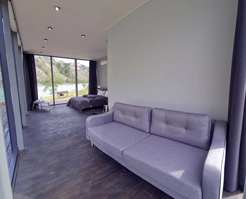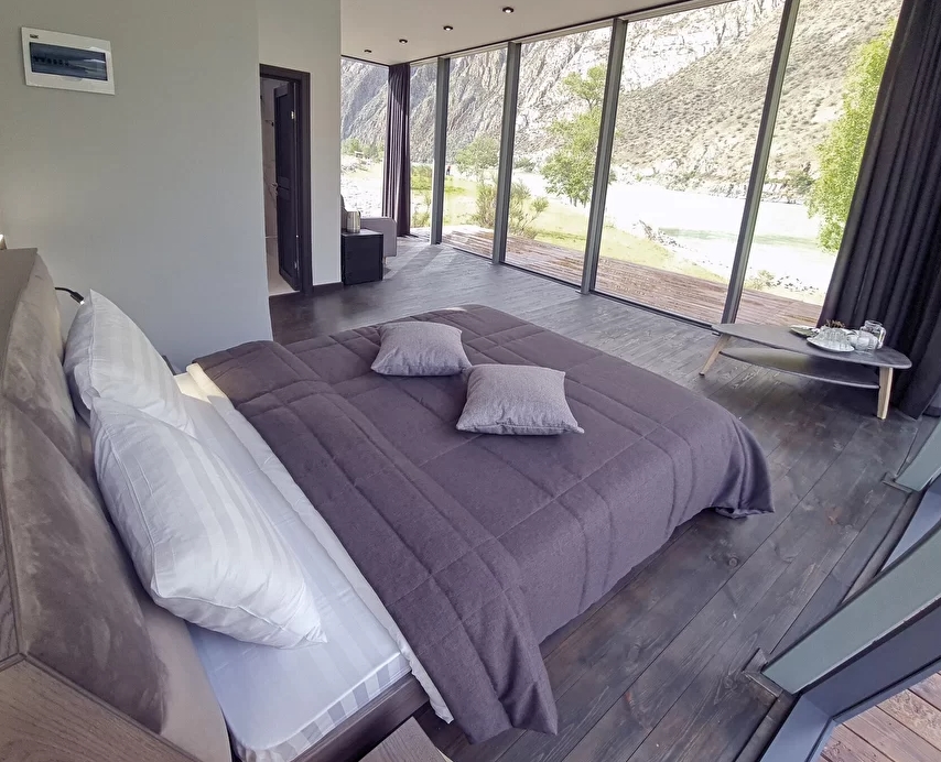- Панорамное стена-окно с видом на катунь и долину.