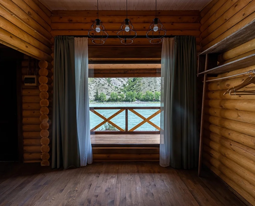 - Панорамное окно с видом на катунь и долину.