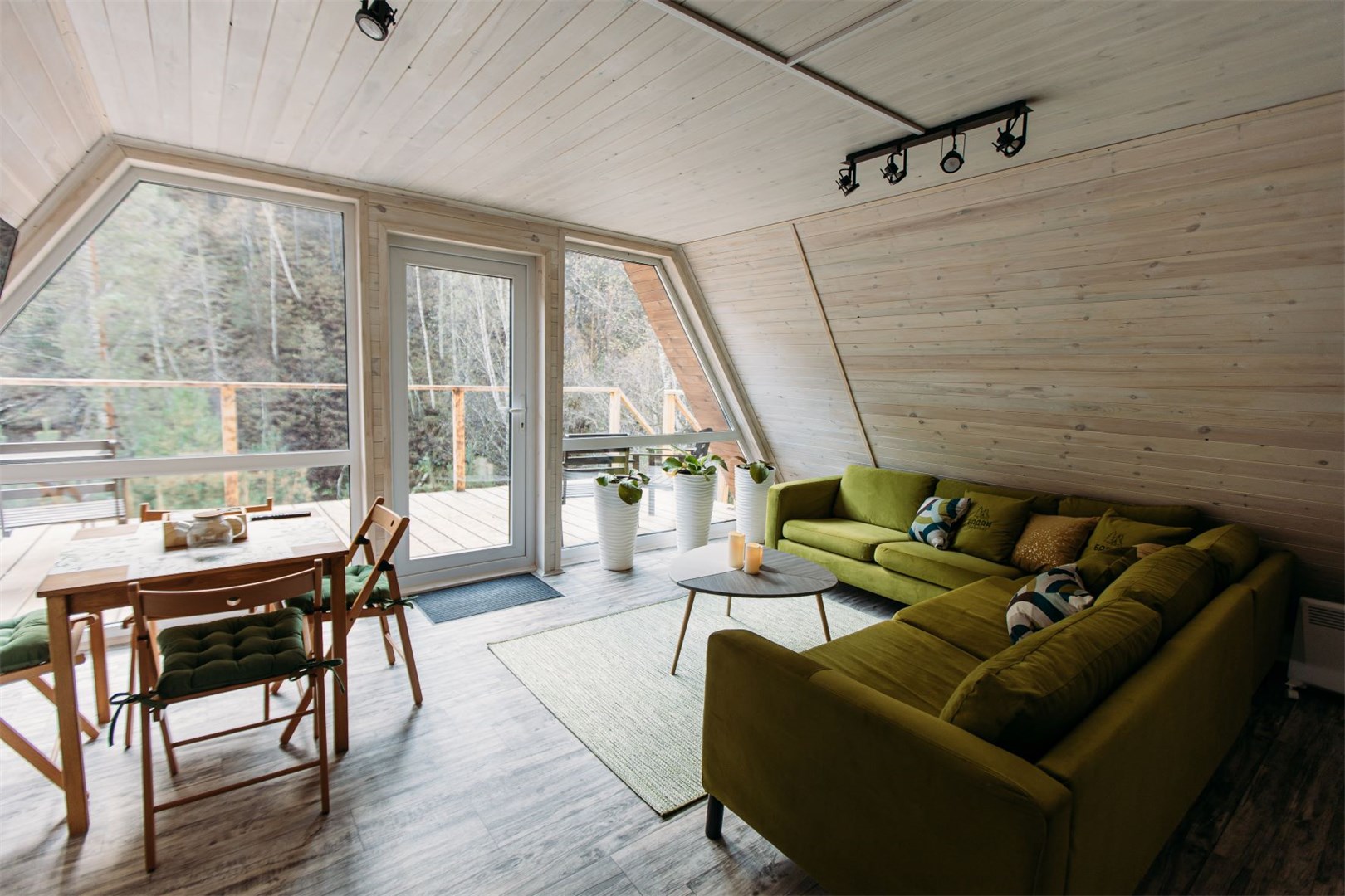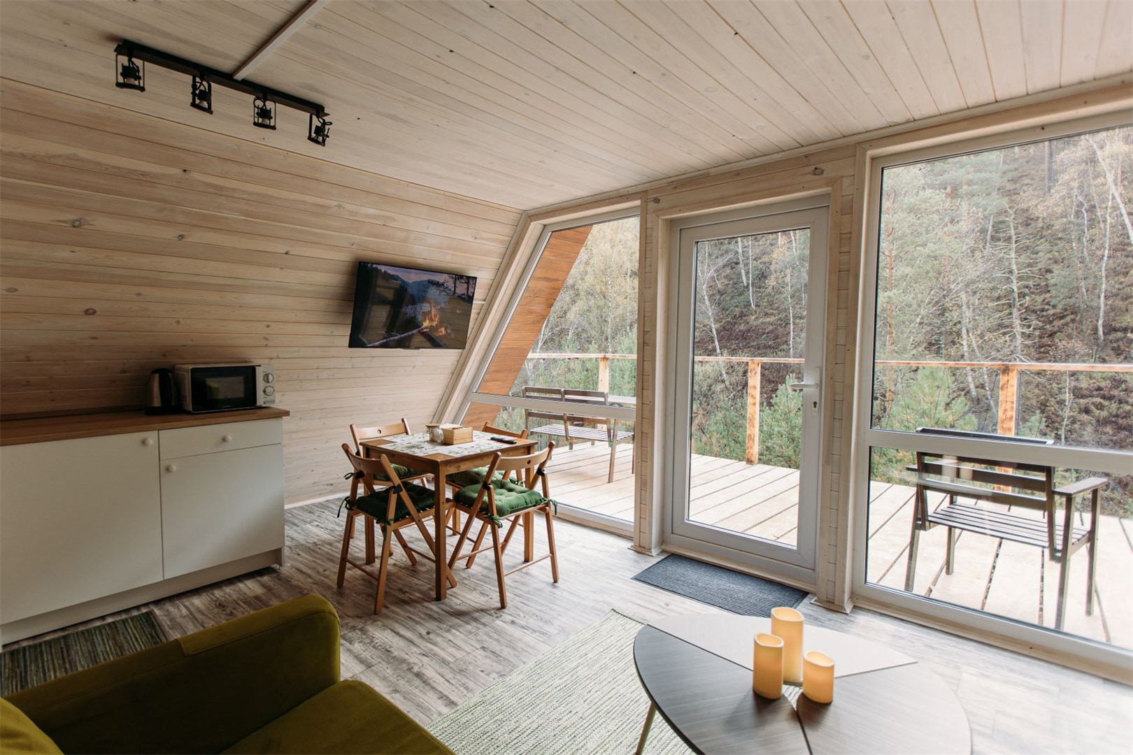 Уютное шале A-Frame в форме треугольника с большими панорамными окнами.