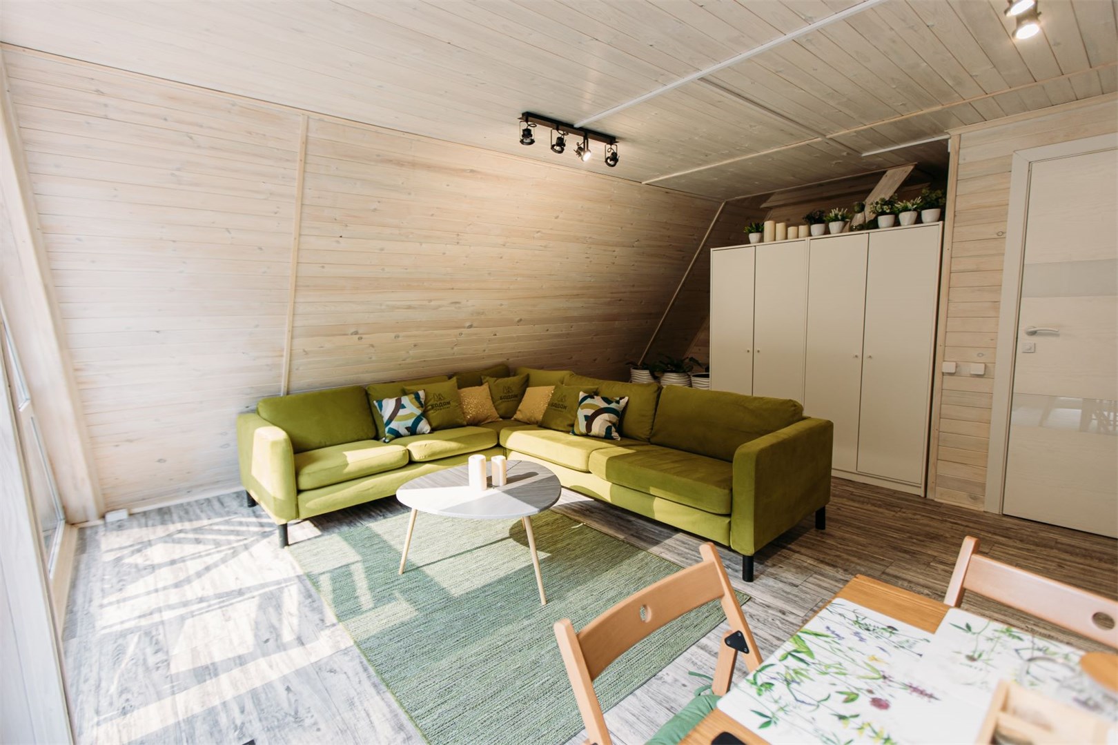 Гостинная зона с большим угловым диваном, журнальным столиком и телевизором. Диван может служить двумя дополнительными спальными местами.