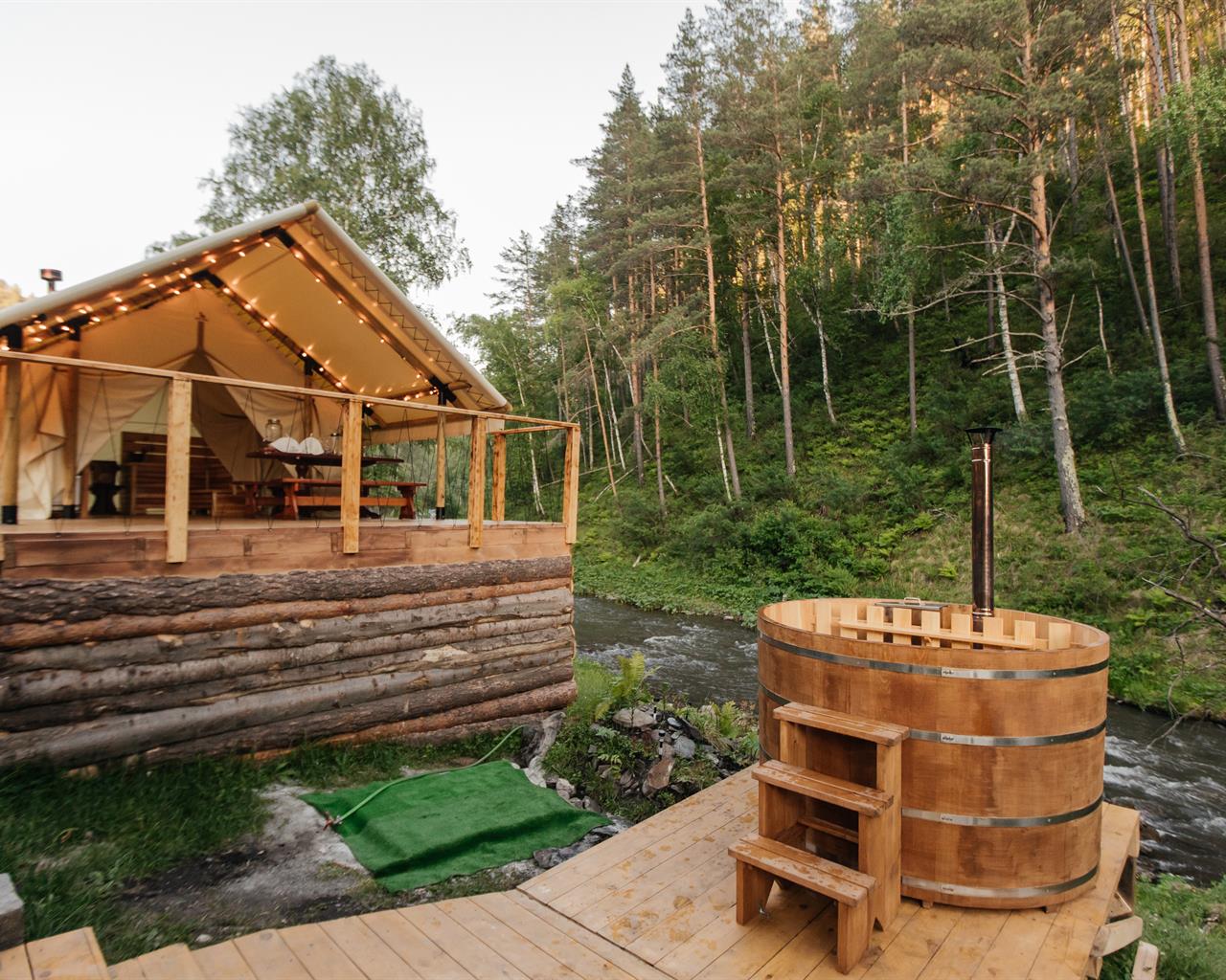 Также гости нашего глэмпинга могут расслабиться в бане и посидеть в кедровом чане, наслаждаясь пейзажами Горного Алтая. А вечер провести у костра с кружкой ароматного травяного чая.