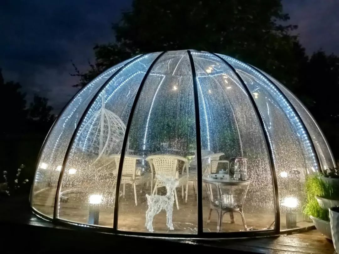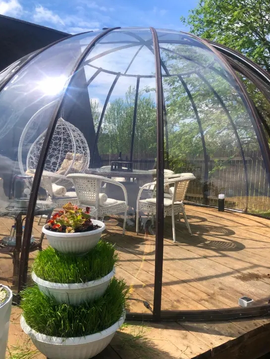 - Купольная прозрачная беседка в ней комфортно разместятся 6—8 человек. Красивый интерьер с круглым столом и плетеными стульями поможет создать приятную атмосферу для отдыха. Через прозрачные стенки беседки можно любоваться природой и небом, наблюдать за проливным дождем и за закатом.