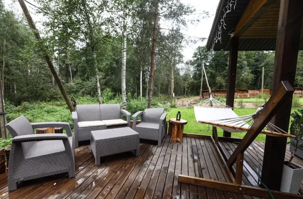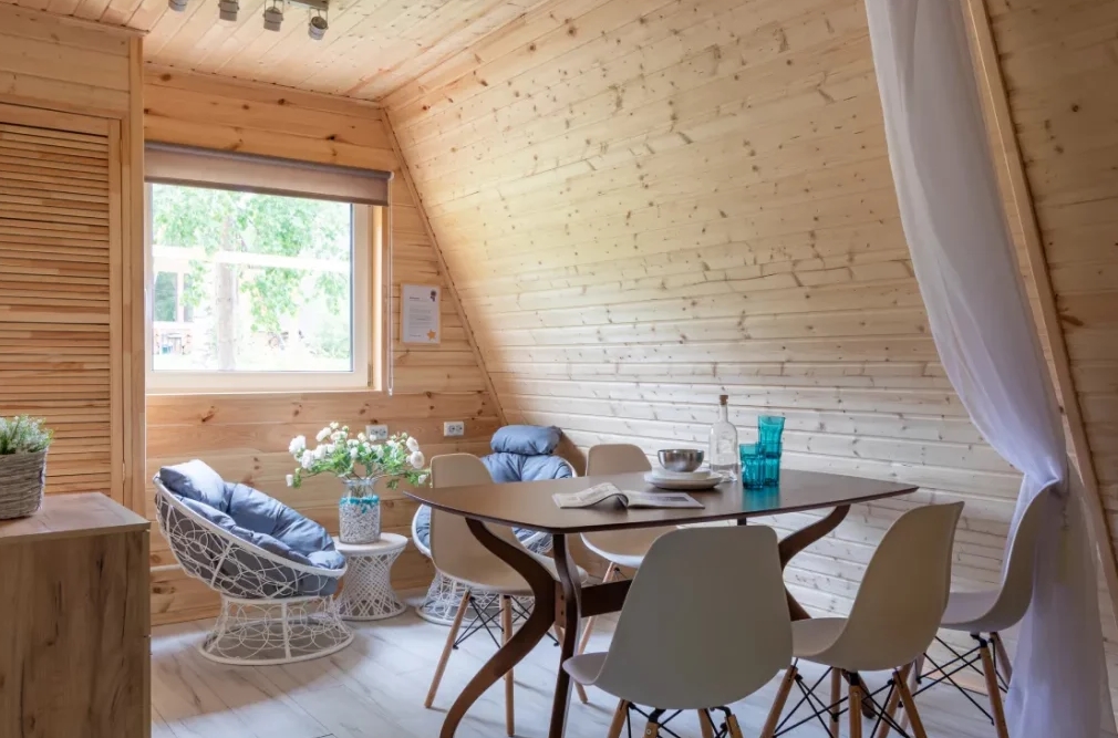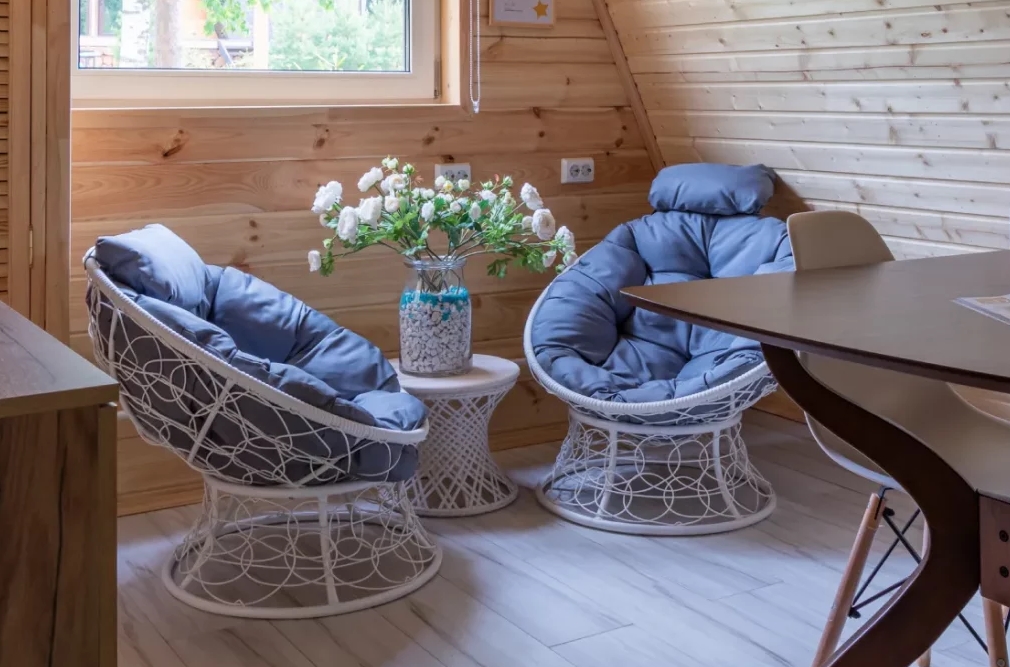 Пообедать можно прямо на террасе, где расположены кресла со столиком и диванчик, или прямо в домике за столом с мягкими и удобными креслами.