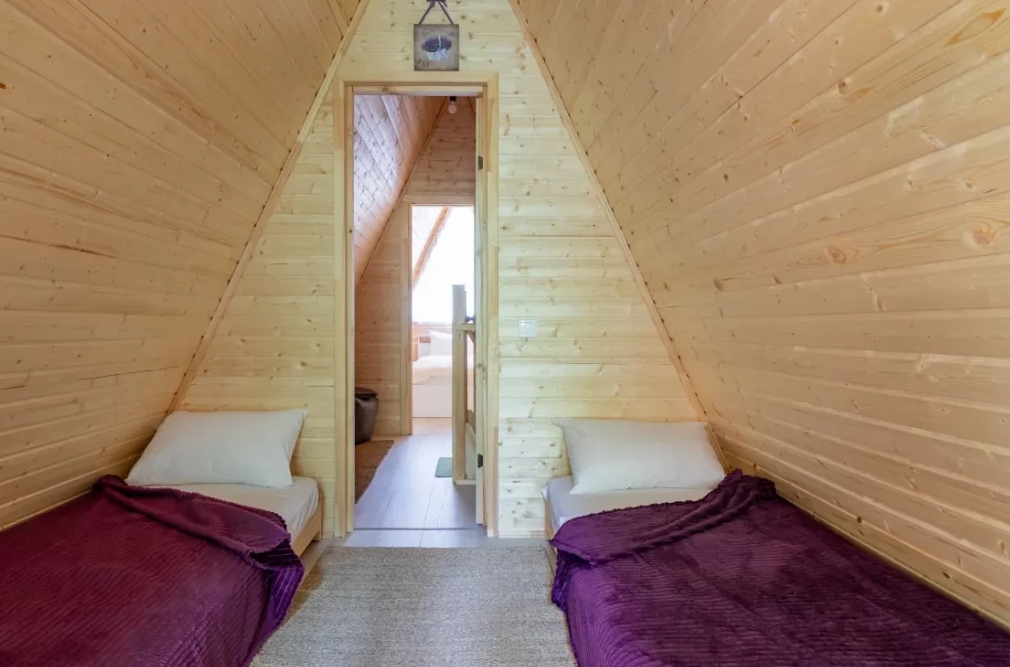 - Вторая с двумя одноместными кроватями, которые можно сдвинуть. Здесь есть балкон с видом на лес.