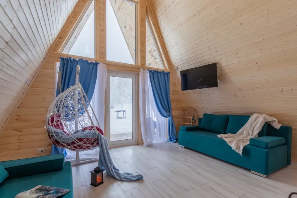 В гостиной есть ТВ, подвесной кокон и раскладные диваны