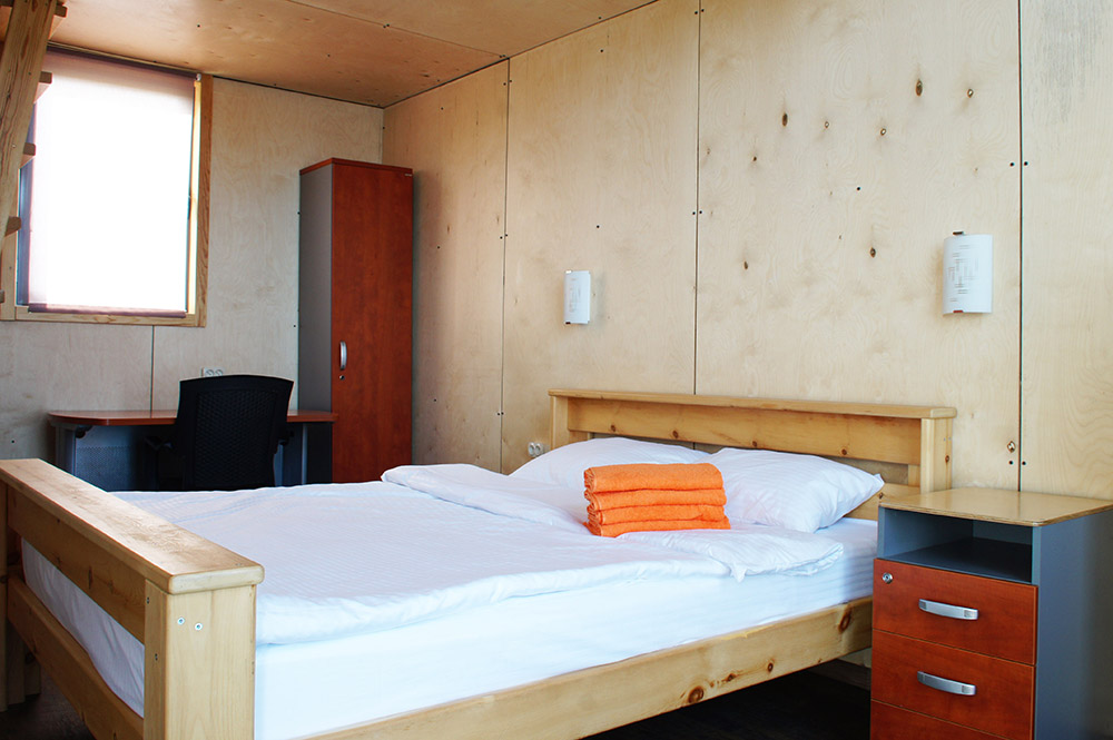 В нем размещены двуспальная и односпальная кровати авторской работы в два яруса, выполненные из массива дерева и оснащенные удобным, ортопедическим матрасом и подушками. Предусмотрен шкаф (тумба) для хранения вещей, постельные принадлежности, оборудован ХОЛОДИЛЬНИКОМ и КОНДИЦИОНЕРОМ!