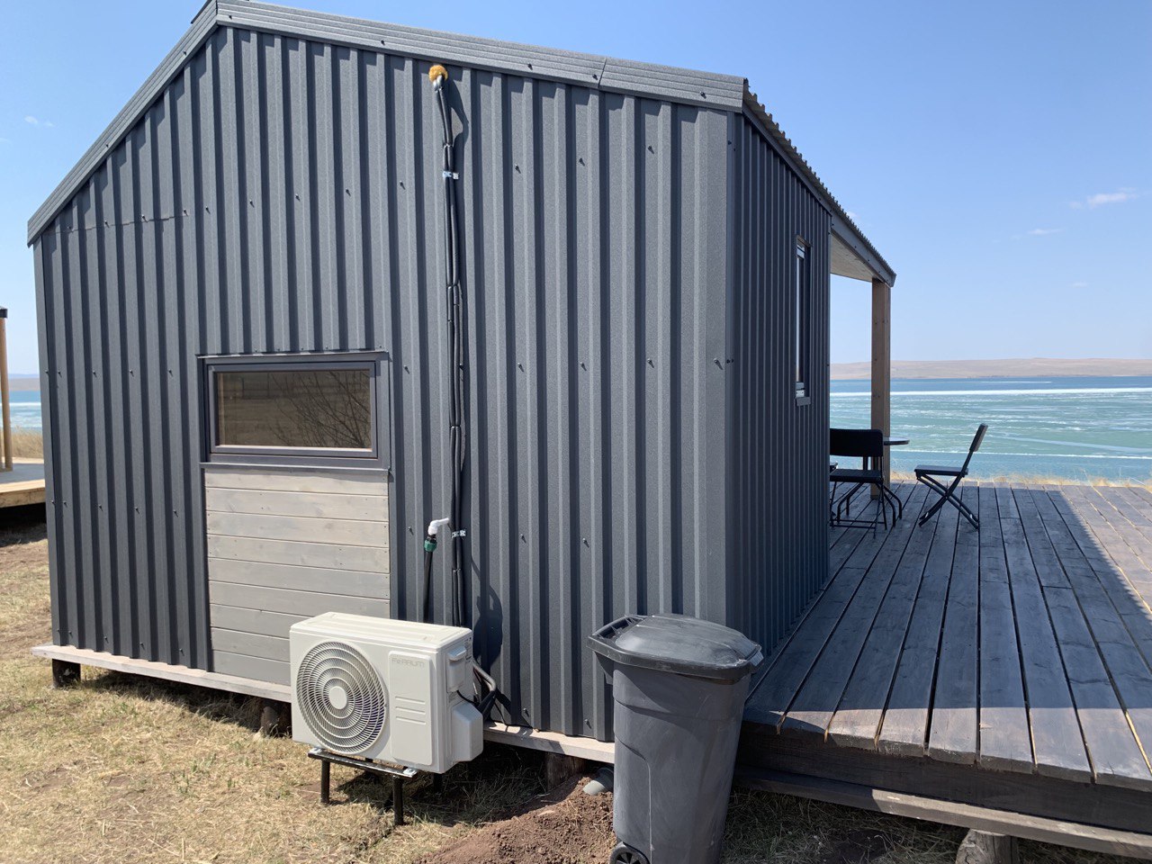 Домик находится на второй линии в 100 м от воды, с крытой террасы которого видно озеро. Домик оборудован мини кухней, водопроводом, рядом находится специальная терраса 2,4*6 м. для отдыха и загара, а в 15 м от дома расположены две беседки для вечернего застолья.