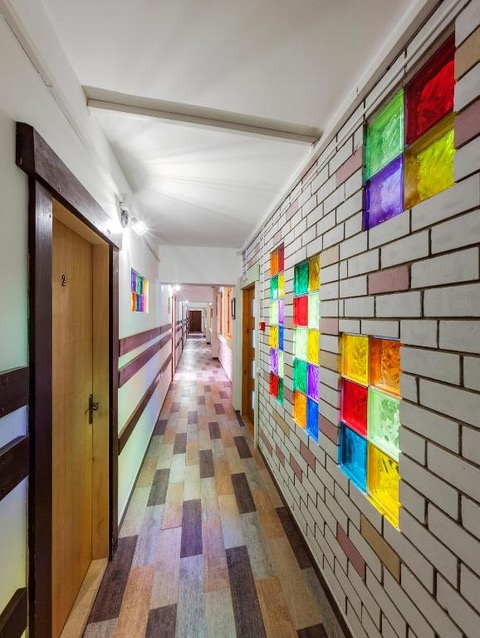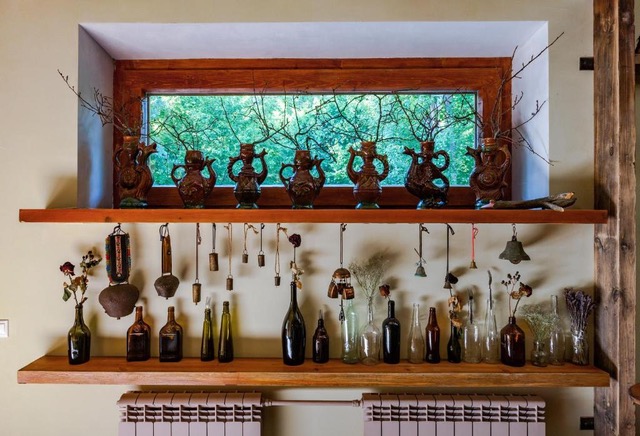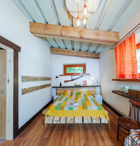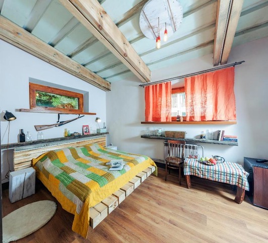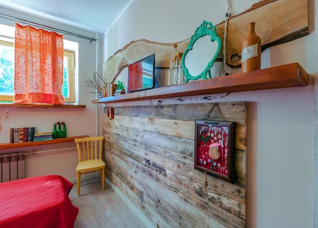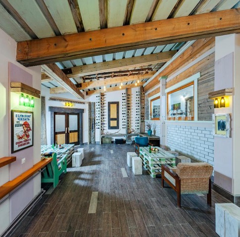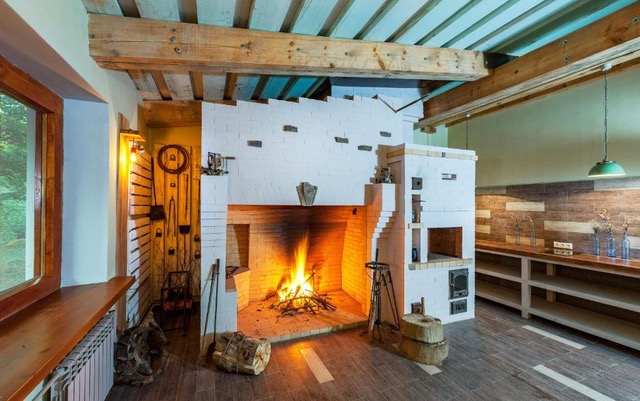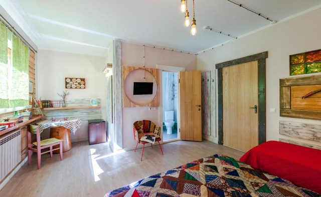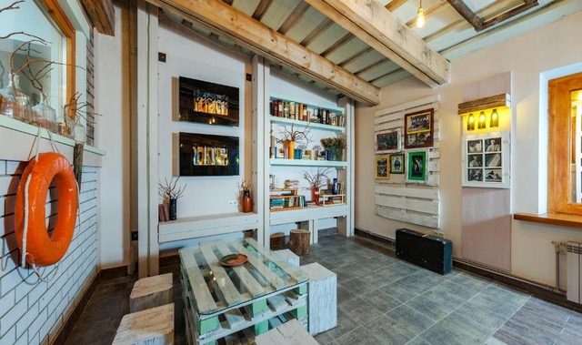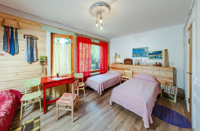 Отель представляет собой дачу с камином-печью и библиотекой.