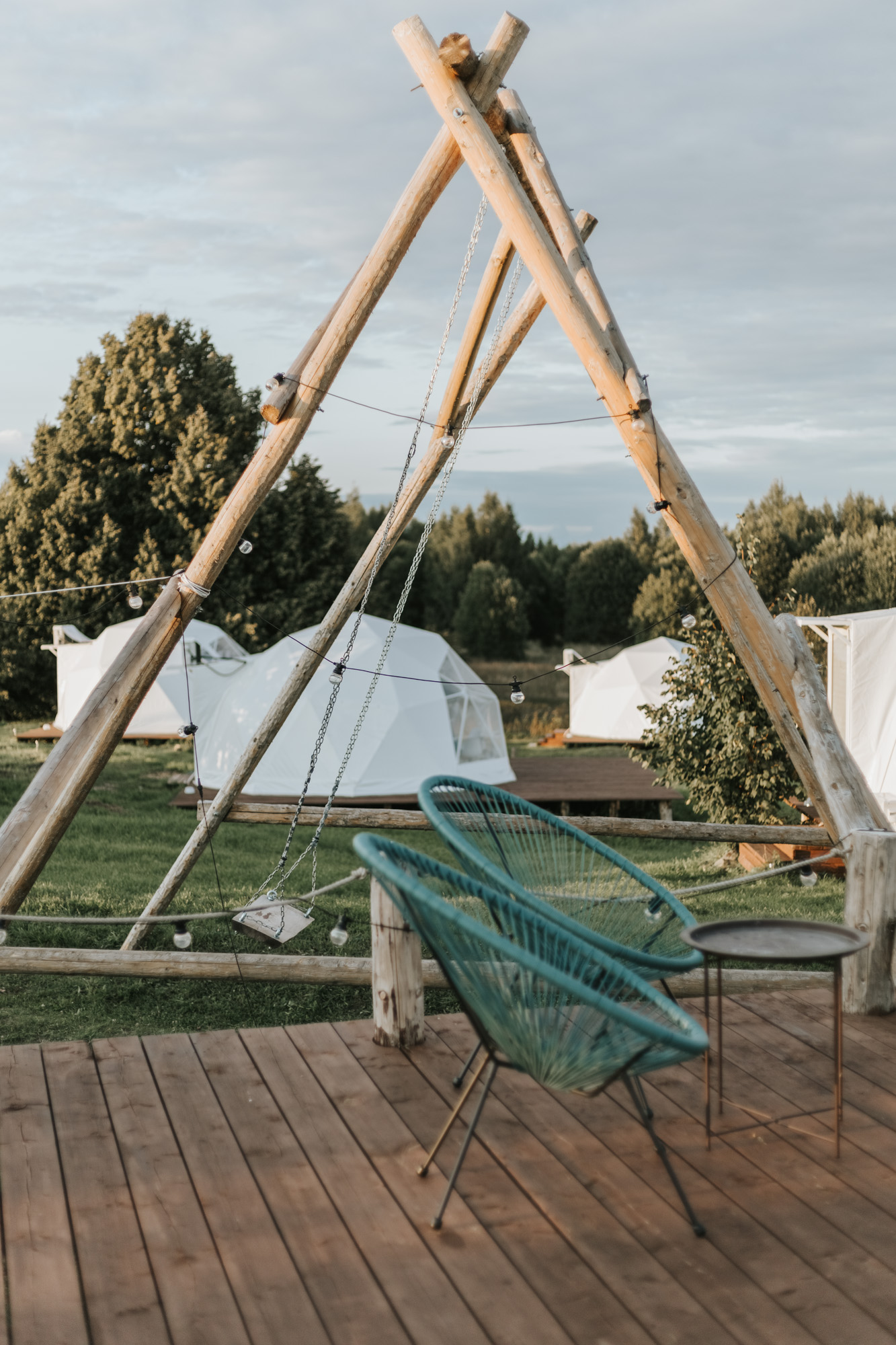 Рядом с каждым шатром мы оборудовали просторную террасу с пуфиками и гамаком, а также общее пространство с мангальной зоной