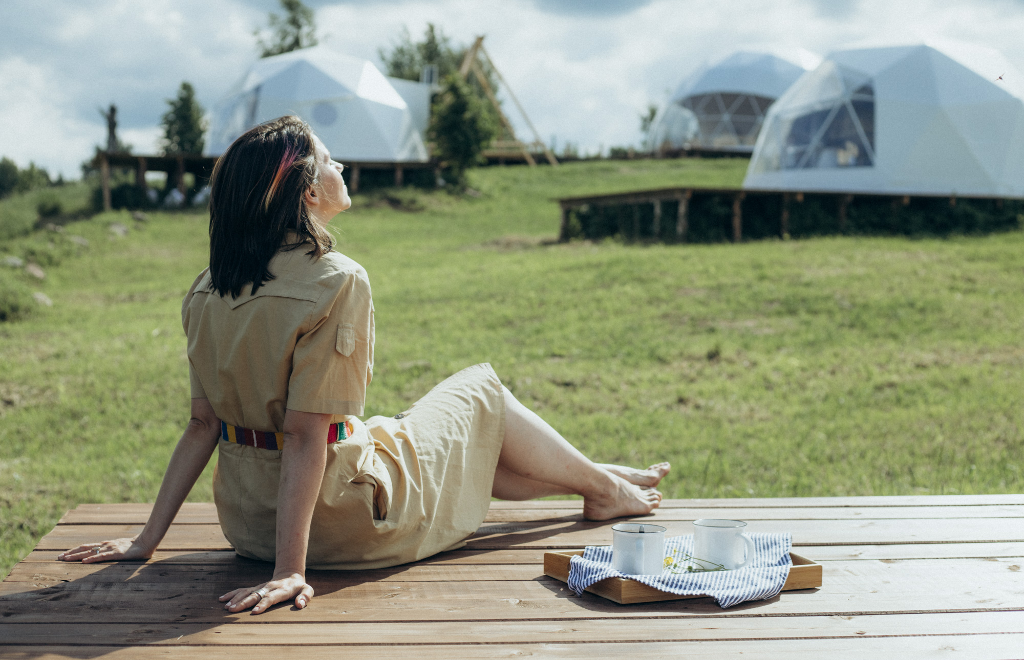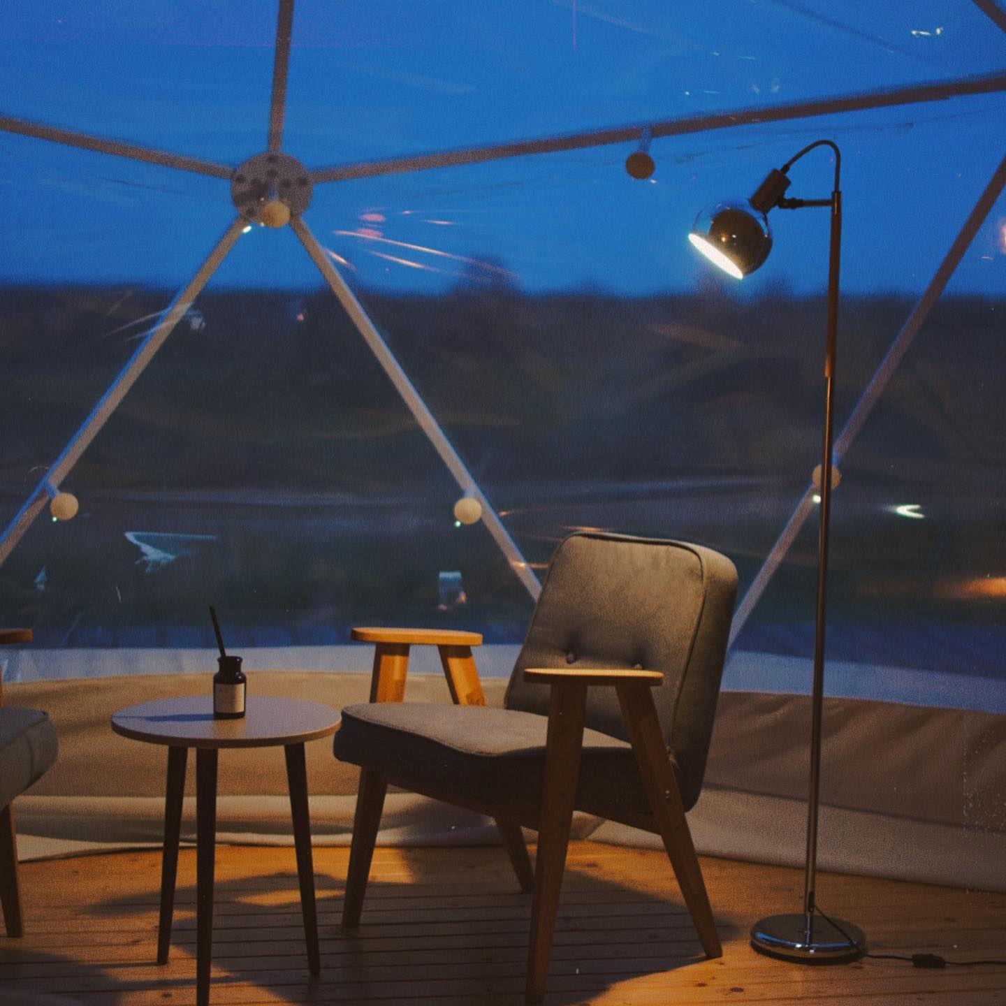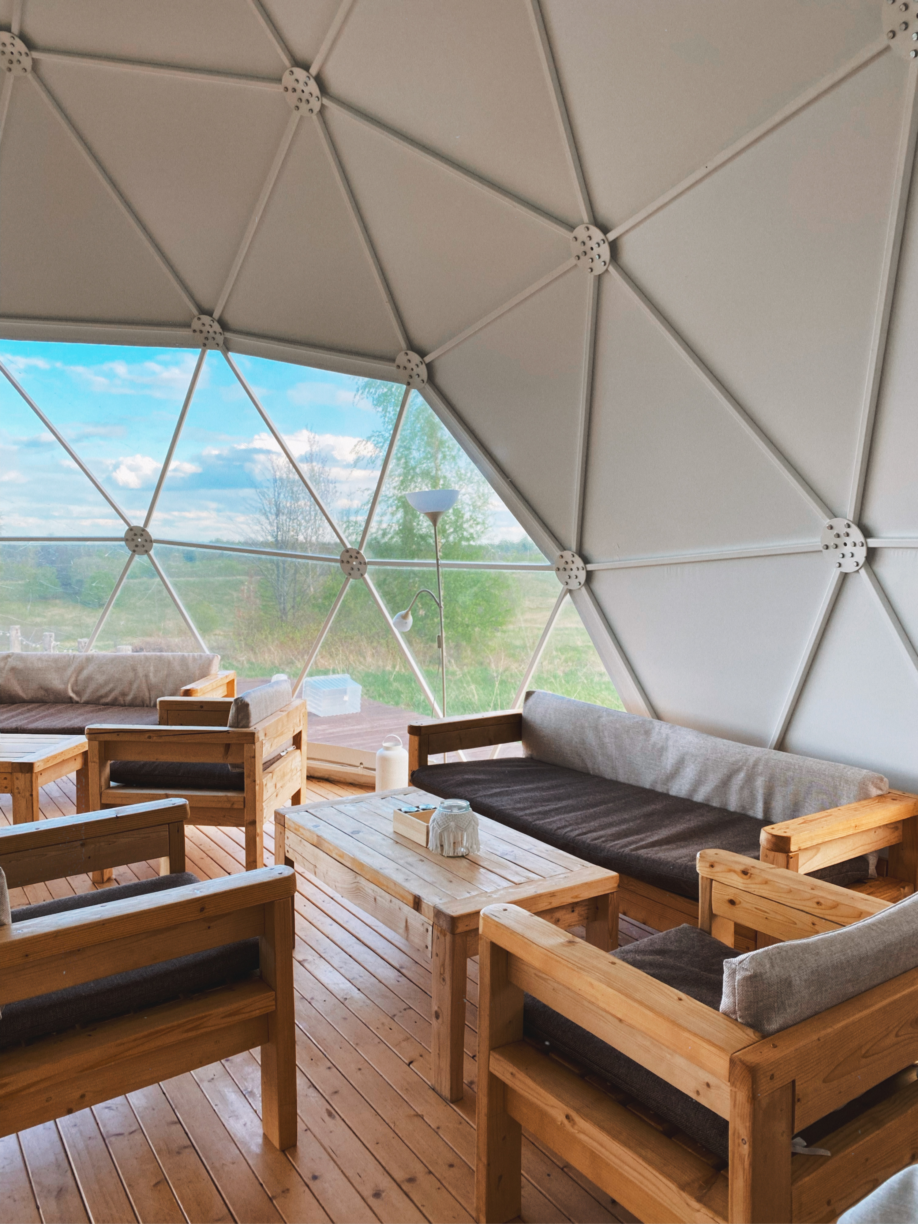 4 геокупольных жилых шатра. 2 Шатра – двухместное размещение; 2 шатра – 3-4хместное размещение. Отдельный Главный шатер – общественное пространство с панорамной террасой.