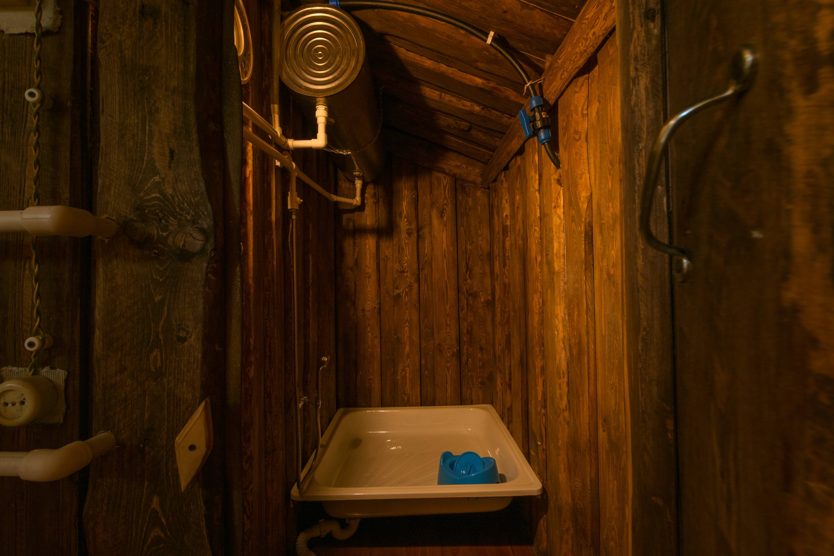 - Уборная в отдельном тёплом здании, разделена на мужскую и женскую, современная.