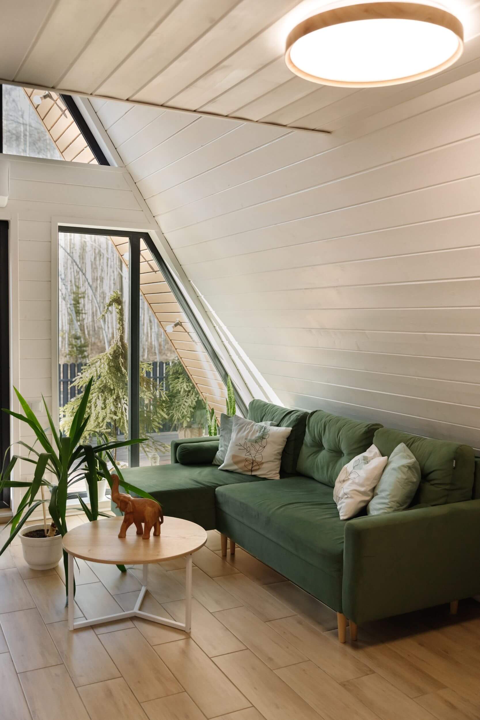 Треугольный дом площадью 72 кв.м., отличается от аналогичных большим размером, вмещая 4 полноценных спальных места. Территория вокруг дома 6 соток, на всей территории работает wi-fi.