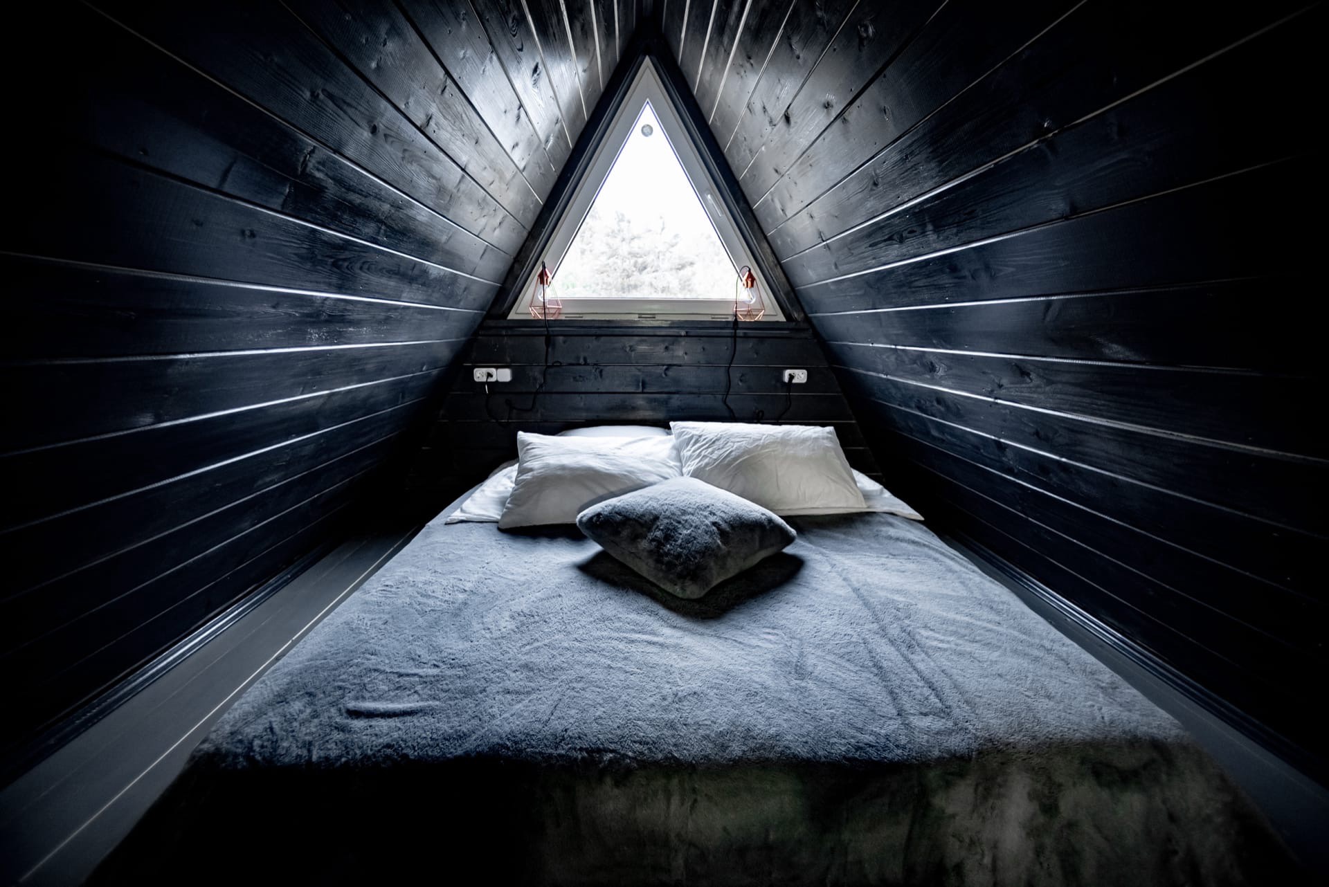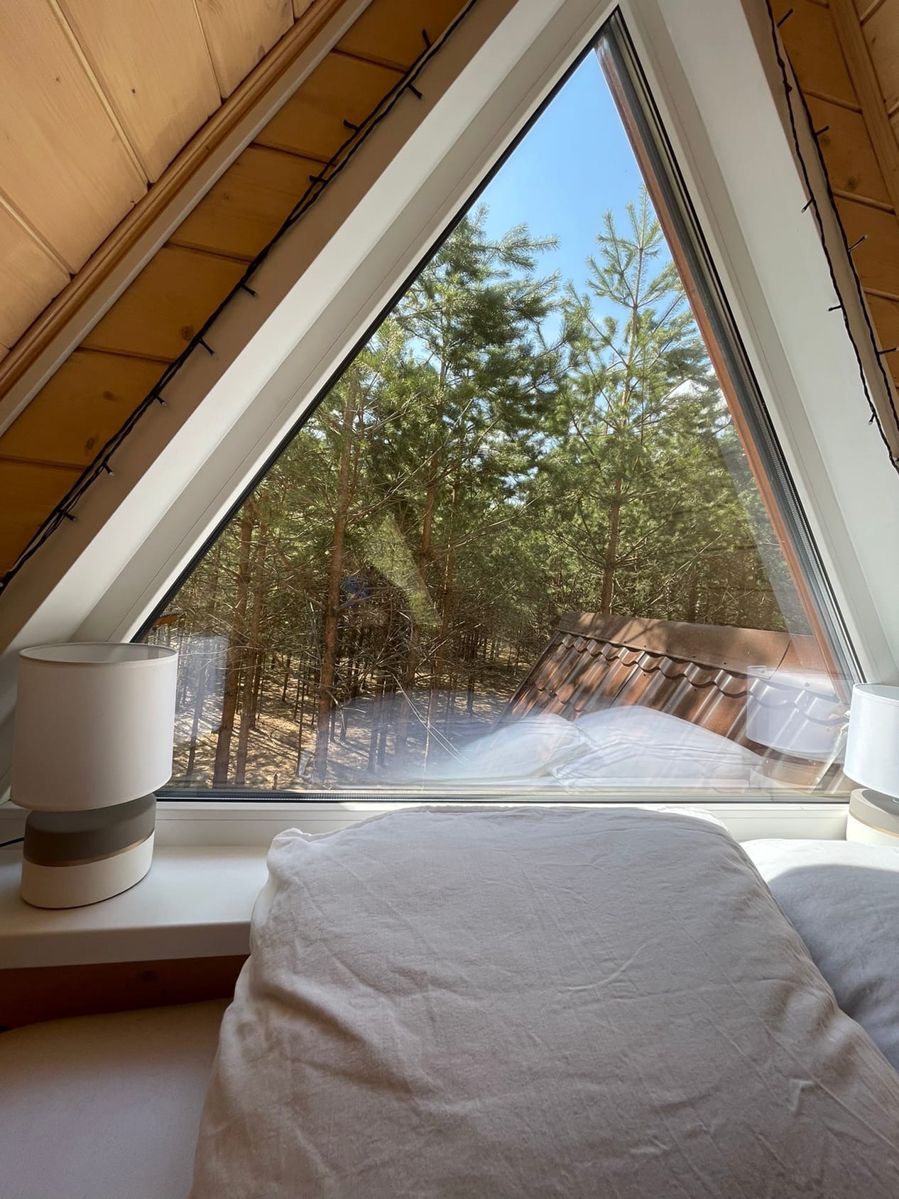 Спальня с панорамным окном на лесное пространство. Это зона релакса на втором уровне. Рассвет и закат в треугольном измерении.
