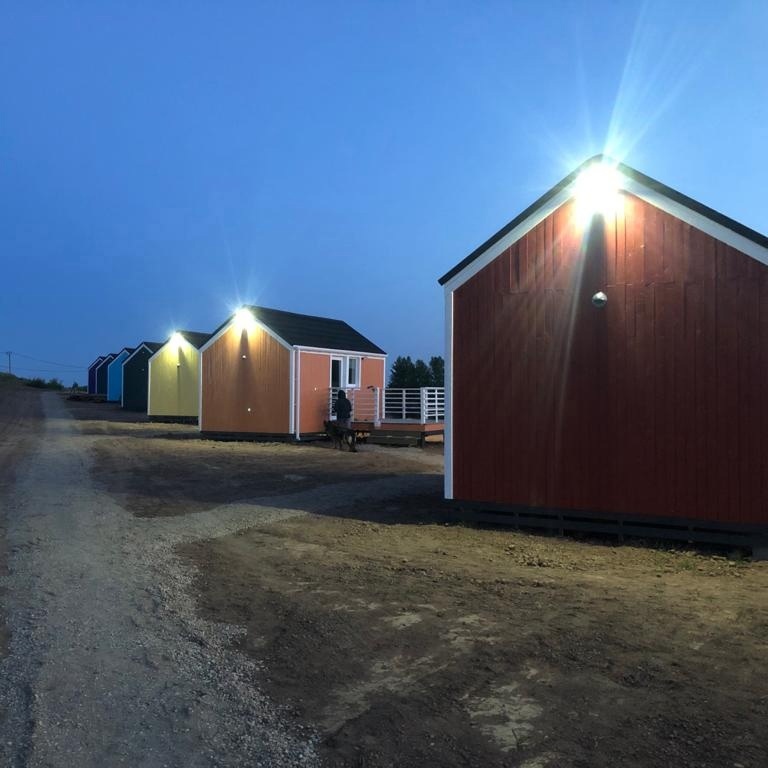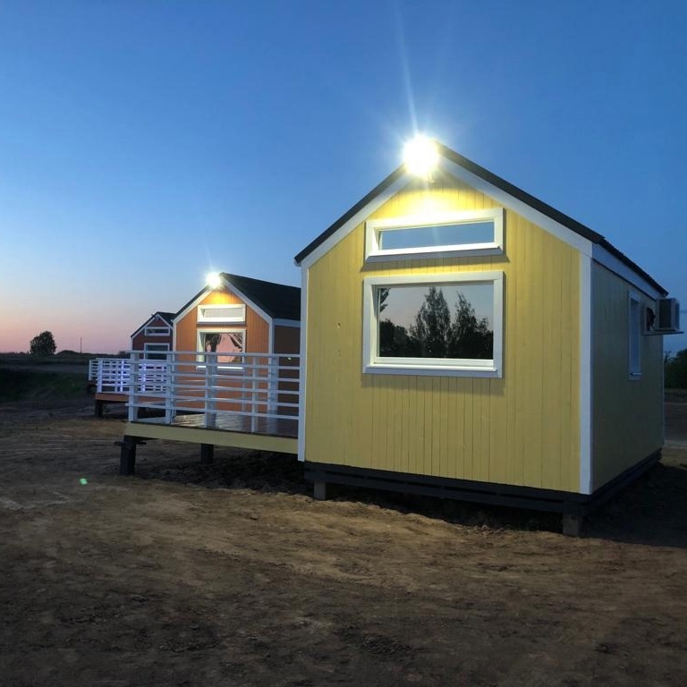 В домиках располагаются двухспальная кровать, обеденная зона, небольшая кухня и санузел с душевой.