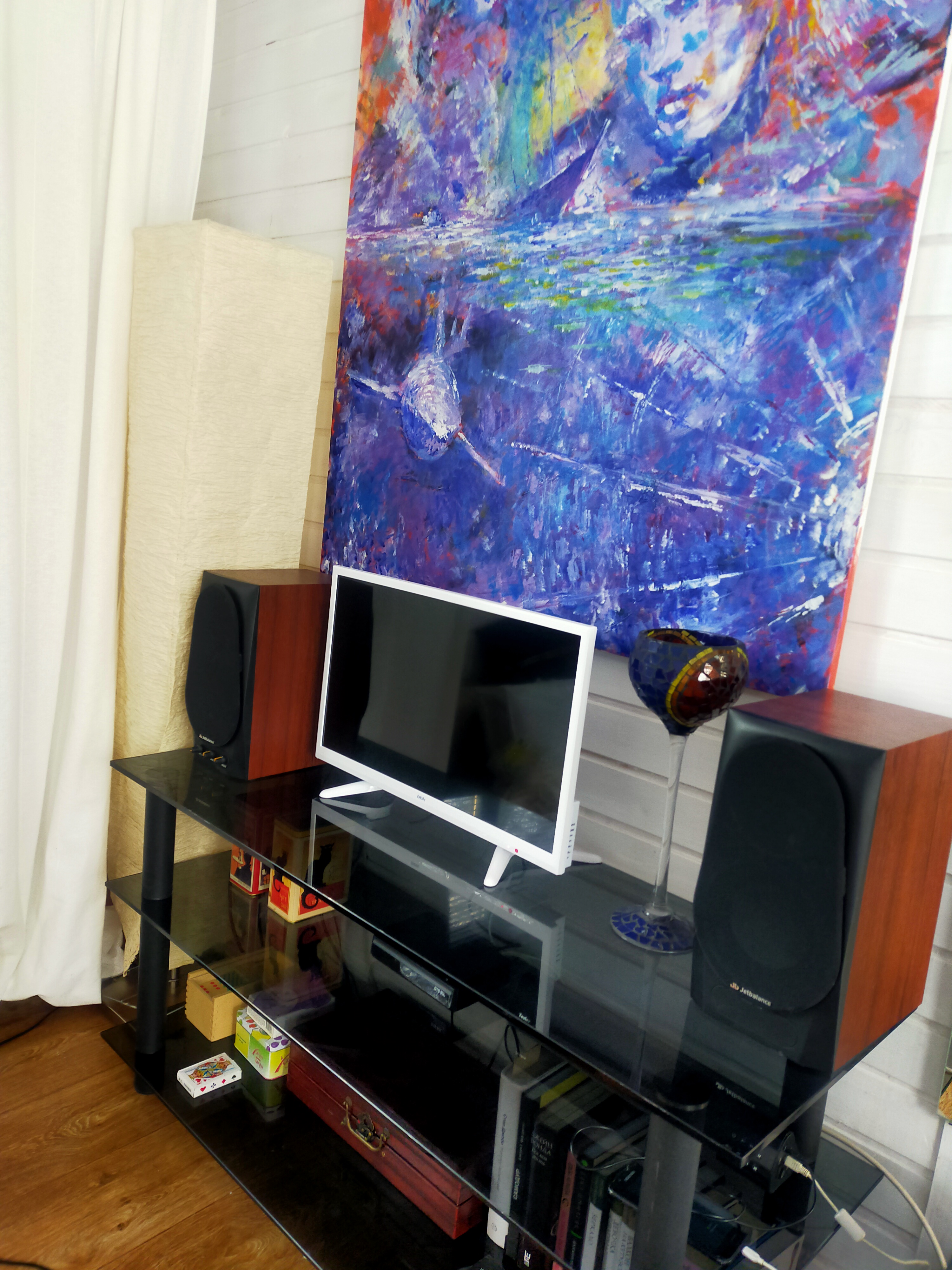 Кухня – газовая плитка, холодильник, посуда, бокалы, вентилятор.