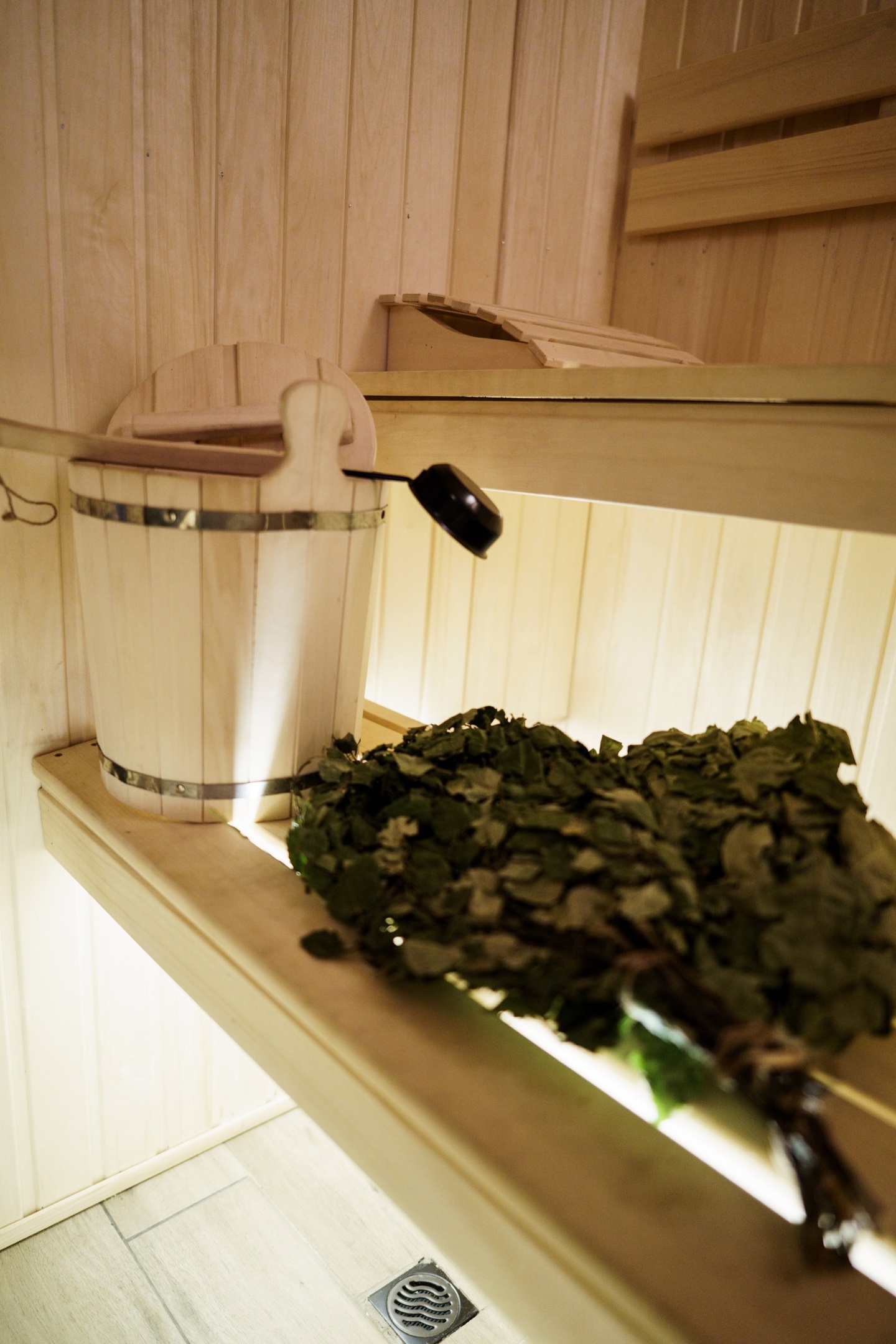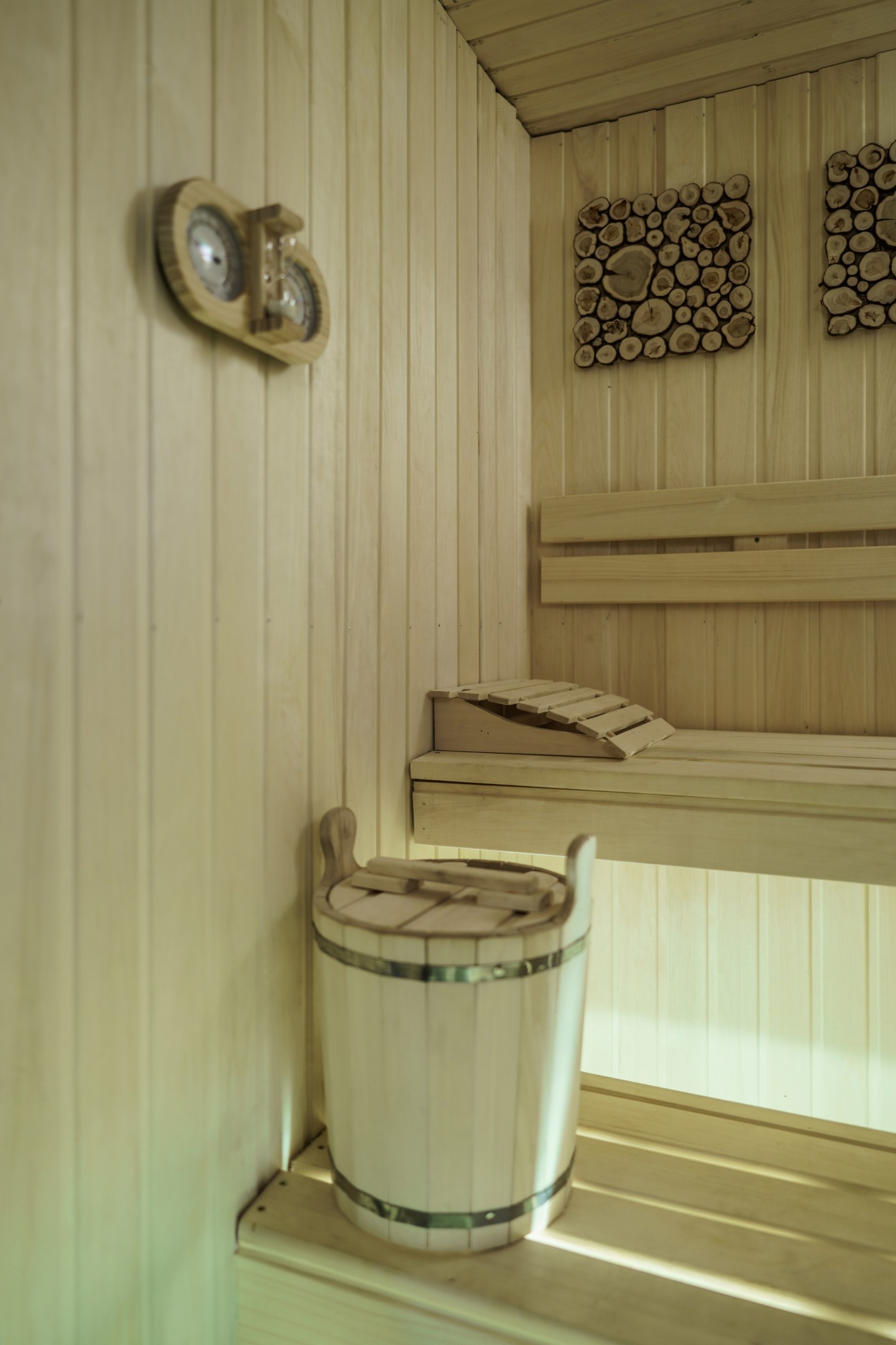 На территории есть баня с дровяной печью, мелкодисперсным паром, просторной комнатой отдыха и душевой с тропическим душем и обливным ведром.