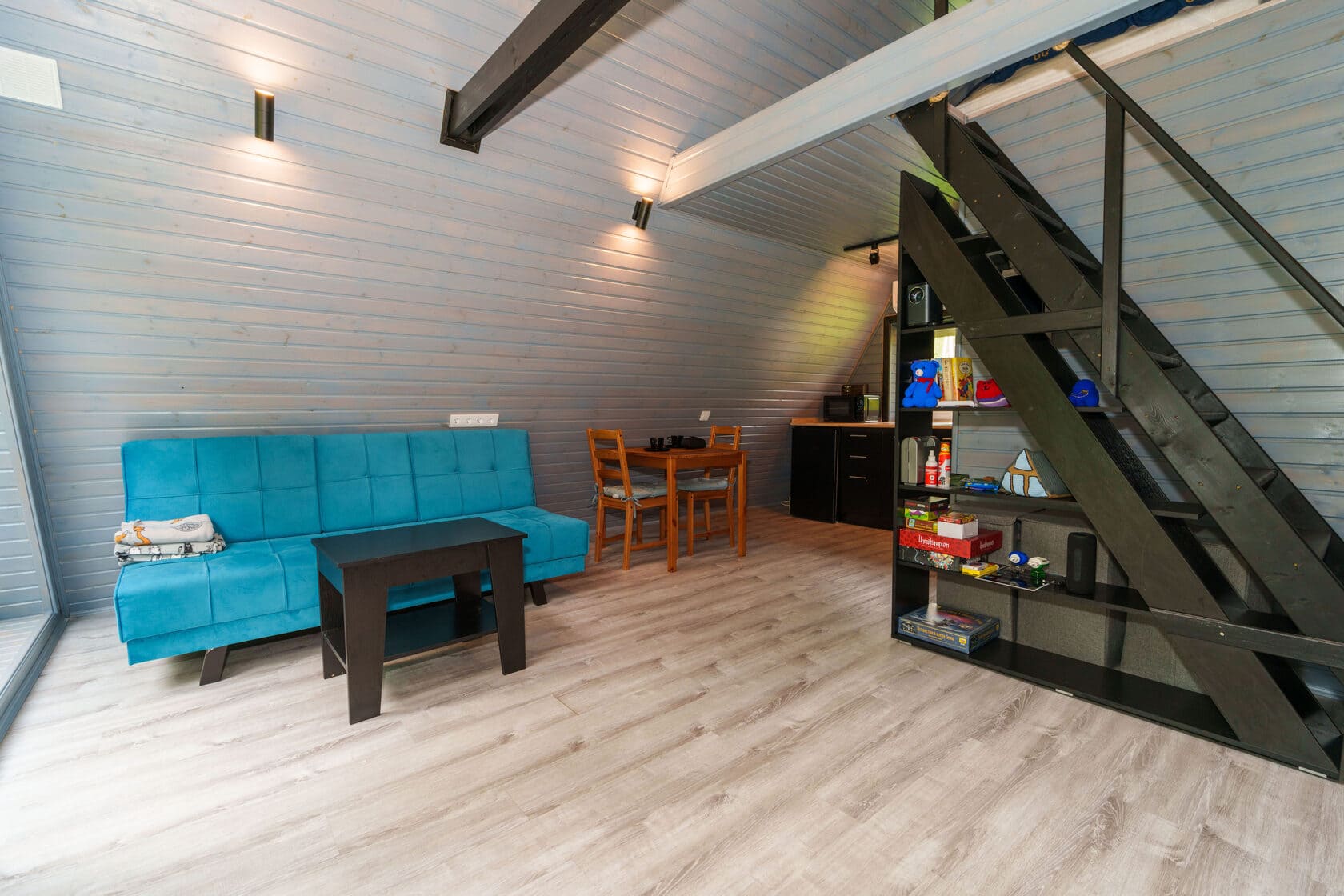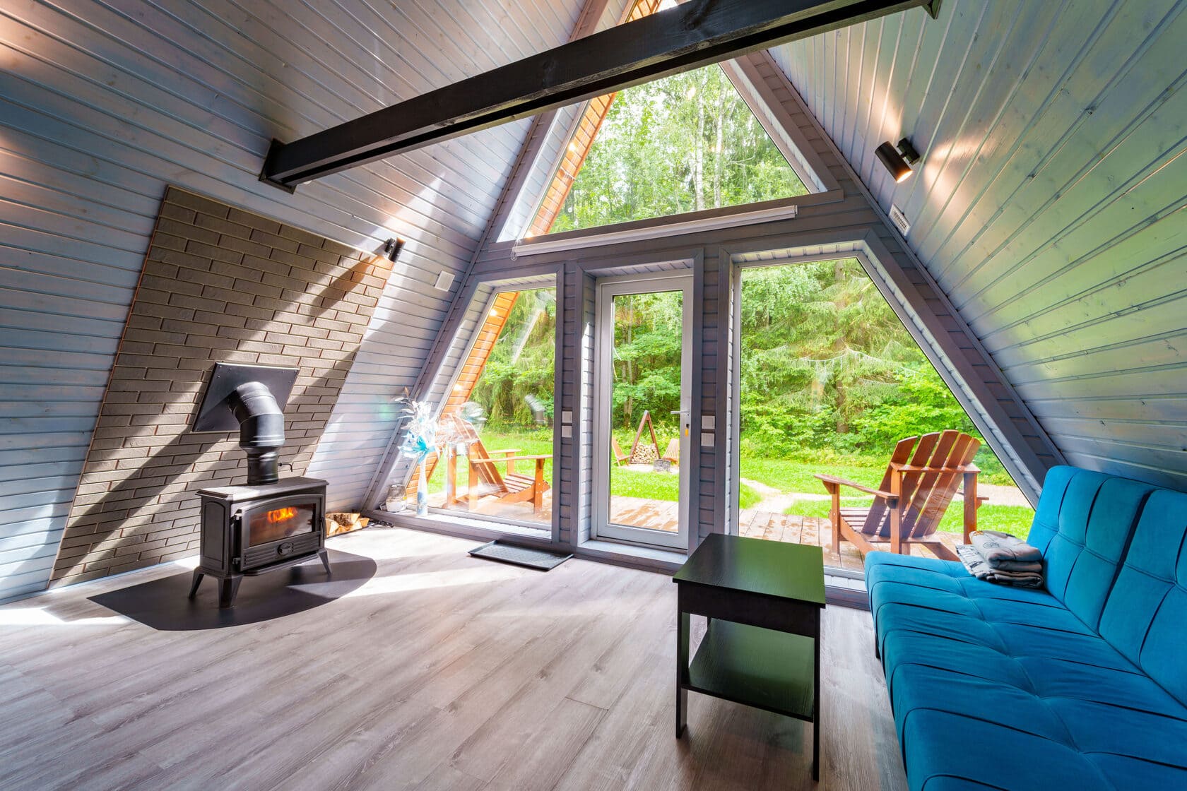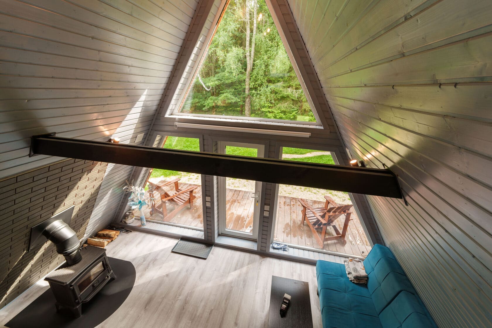 Уютный дом-шалаш с панорамными окнами и широкой террасой даст возможность наслаждаться красотой окружающей природы даже в дождливую погоду или когда не хочется выходить на прогулку. У домика свой естественный забор – густой лес.