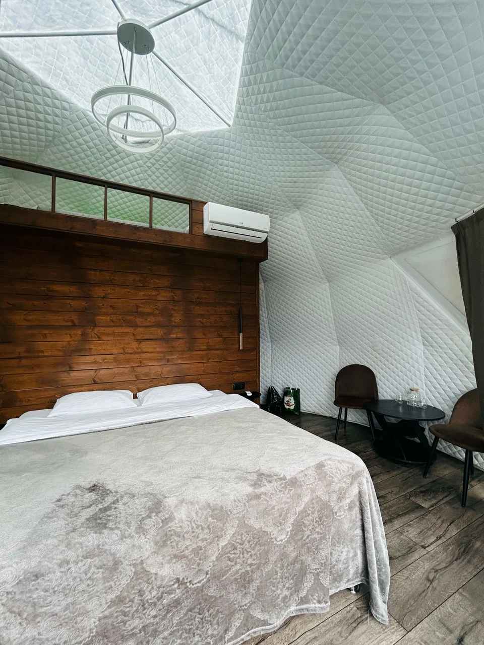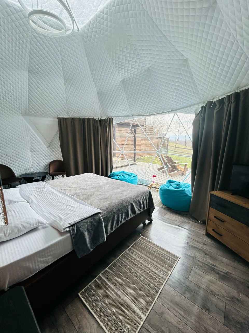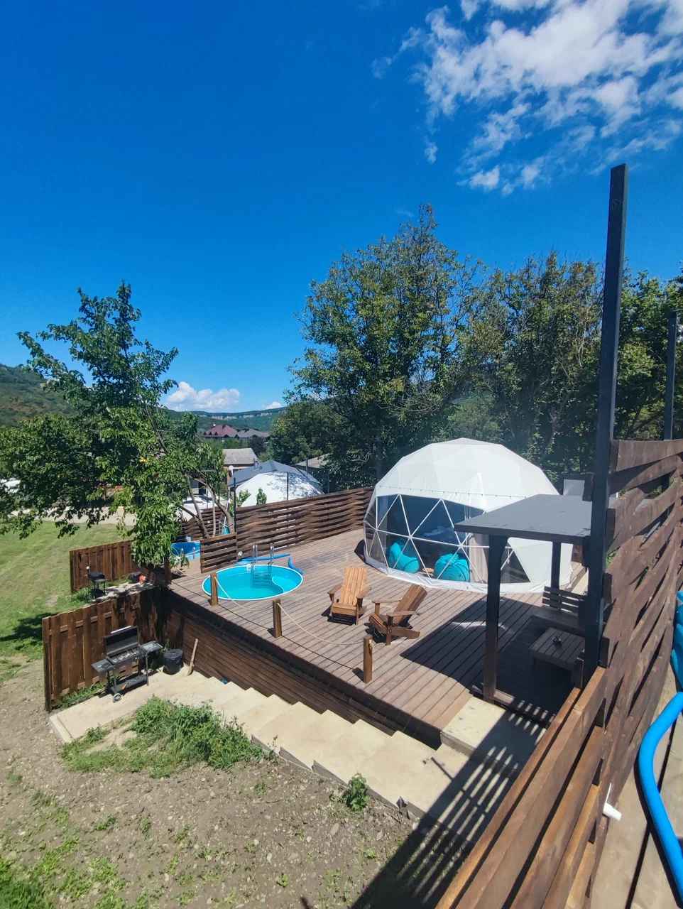 Глэмпинг Даховские Сферы – отличное место для отдыха и уединения на природе в тихом уголке станицы Даховская. Глэмпинг находится в живописном месте, а именно на обрыве скалы. Здесь вы не увидите привычных домов и создающих лишний шум городских построек. Только шепот природы Адыгеи, потрясающий вид на горы и реку Белая, неповторимая атмосфера и ваш идеальный отдых в комфортных сферах с панорамным остеклением и продуманным интерьером. На территории Даховских Сфер находятся три домика, отделенных друг от друга и расположенных на расстоянии полной изоляции от соседей и персонала.