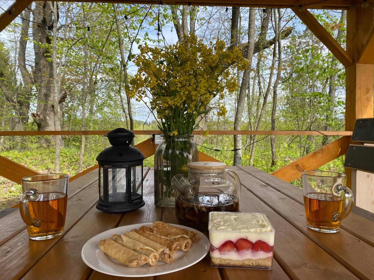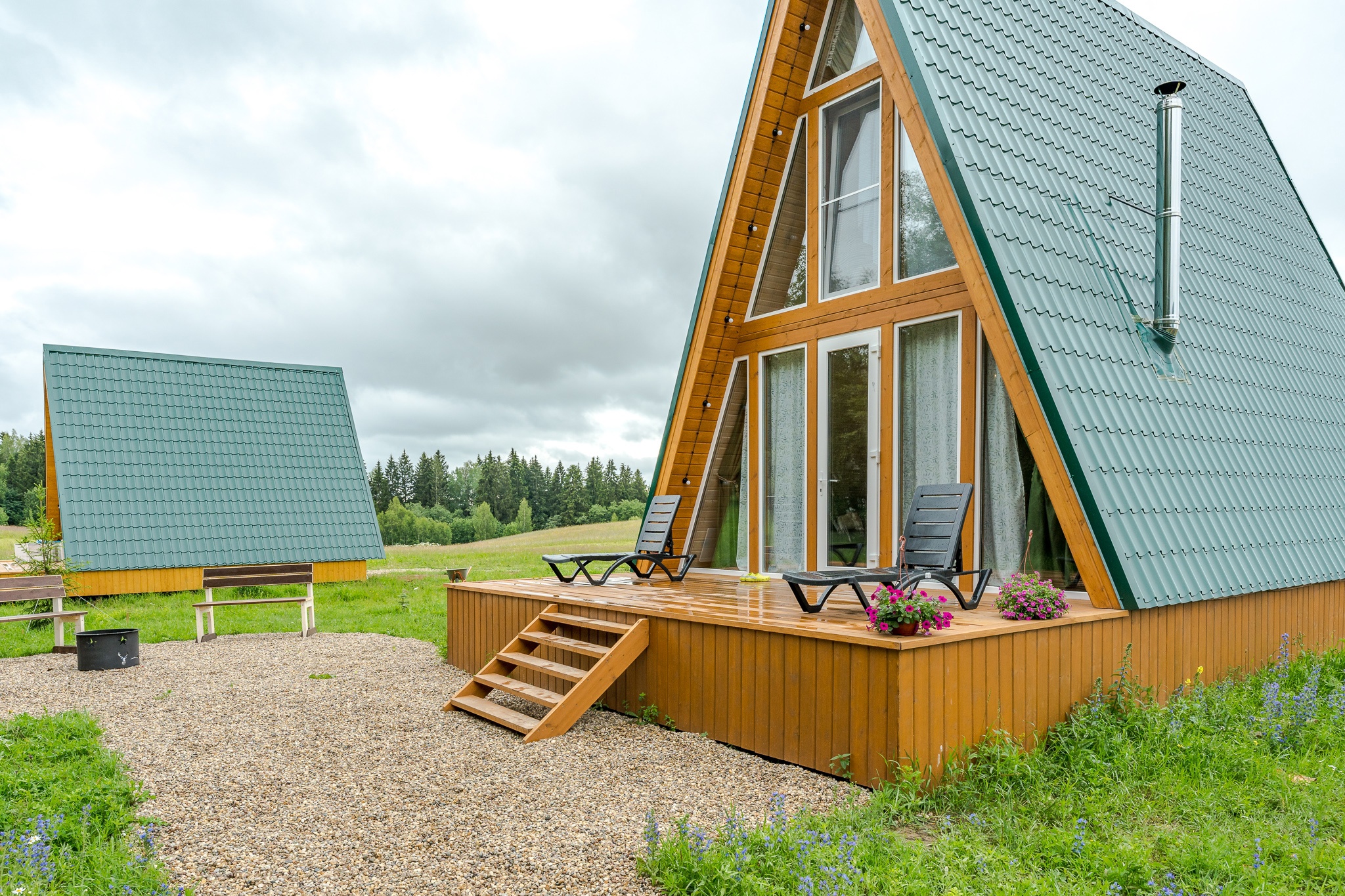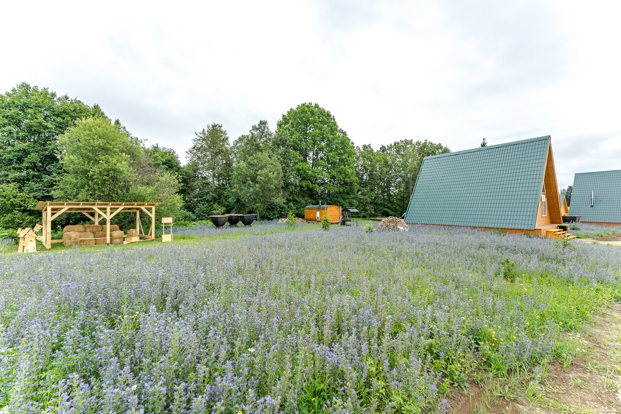 На территории в 2 Га вы найдете 6 домов треугольной формы с горячими купелями, террасами, индивидуальными беседками, где можно провести уютный вечер у костра с семьей, друзьями, коллегами и любимыми. Но это еще не все!