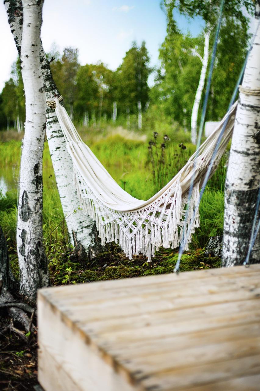 На уютной веранде (она, кстати, закрывается на случай холодной погоды) - шезлонги и столик, возле бунгало висит гамак и установлен мангал.