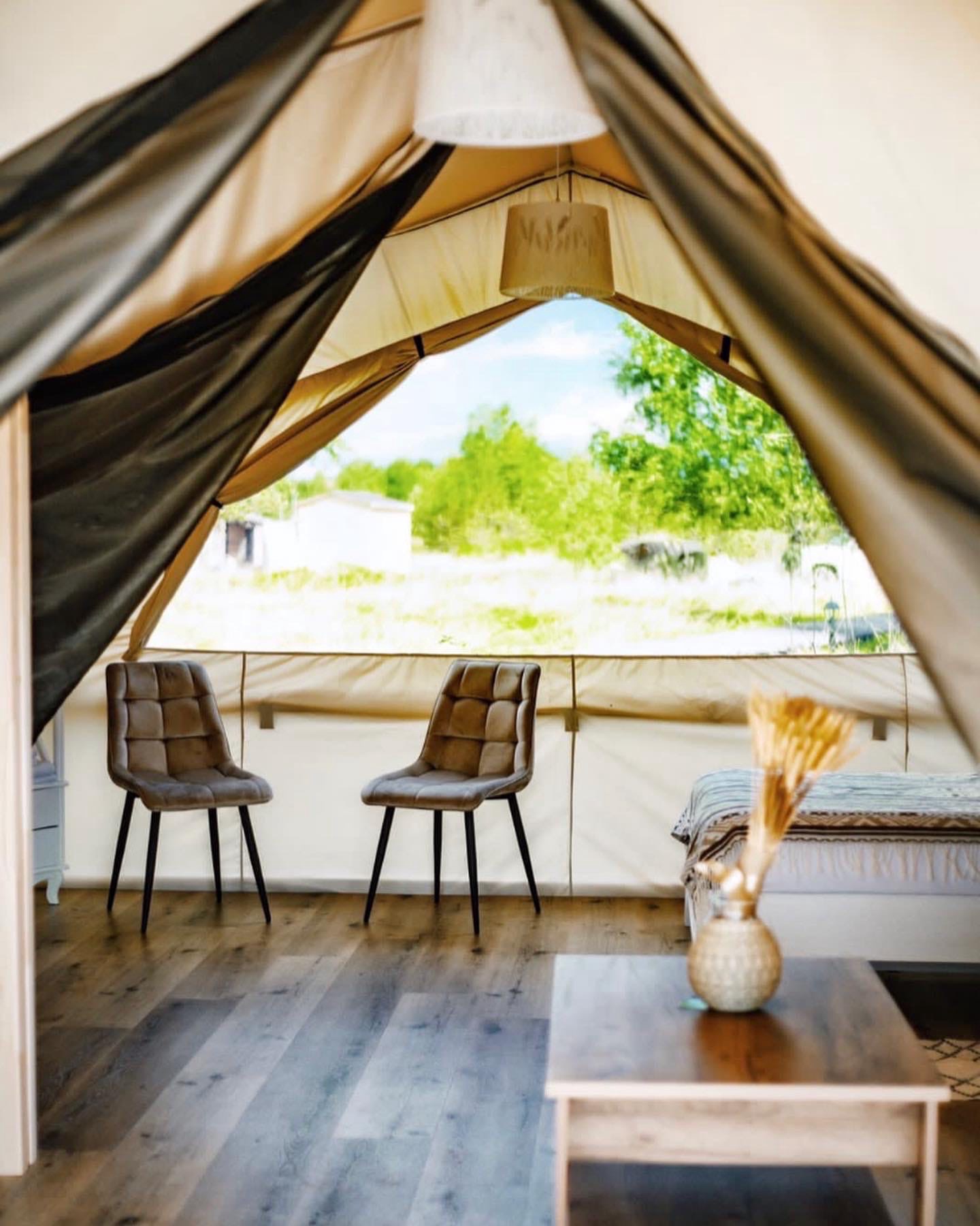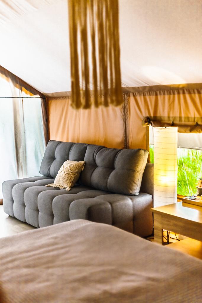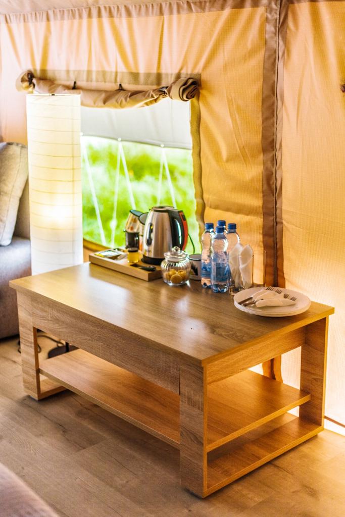В палатке «Солнечный домик» - круглая кровать, прикроватные тумбочки, 2 столика, стулья, вешалка. Разумеется, чайная станция, пледы и средства от комаров.