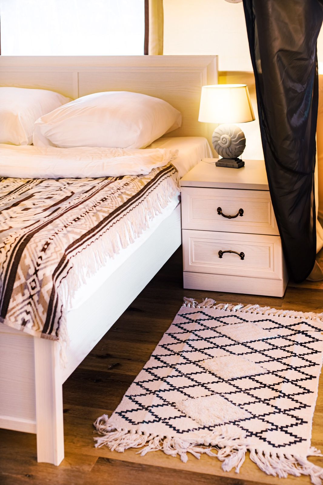 И много красивого атмосферного декора - тёплый коврик, оригинальные светильники и множество уютных мелочей.