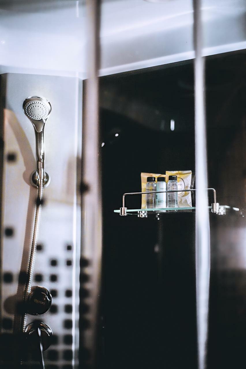 В бунгало установлен полноценный банный модуль с душевой кабиной, раковиной и биотуалетом, есть полотенца и банные халаты. Зеркало с подсветкой. И большое окно с красивым видом на лес (разумеется, окно закрывается, обеспечивая, когда нужно, необходимую приватность)