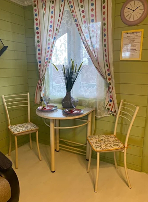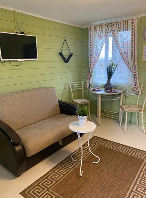 А для любителей сауны - своя закрытая территория с домиком с сауной и комнатой отдыха оформленной в деревенским стиле. В сауне вы можете пользоваться вениками, а также расслабиться в комнате отдыха для компании не более 6 человек.