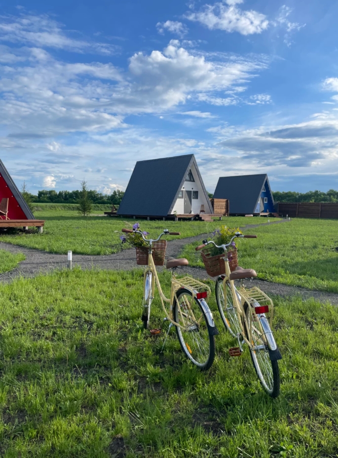 На территории глэмпинга есть множество развлечений: японские бочки фурако, дворик с сауной, костровая и мангальная зона, велосипеды, волейбольная площадка и даже возможность покататься на тюбингах зимой.