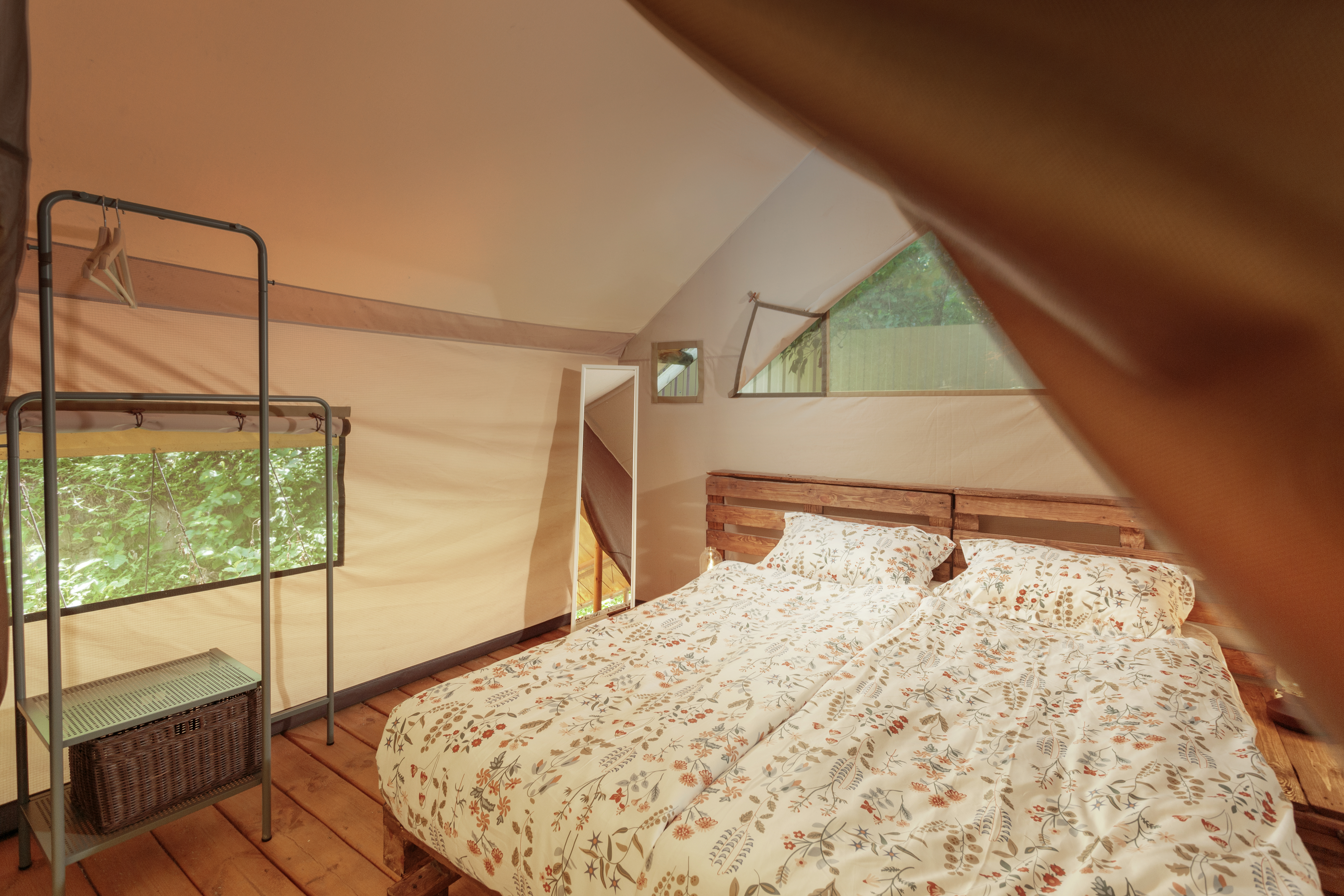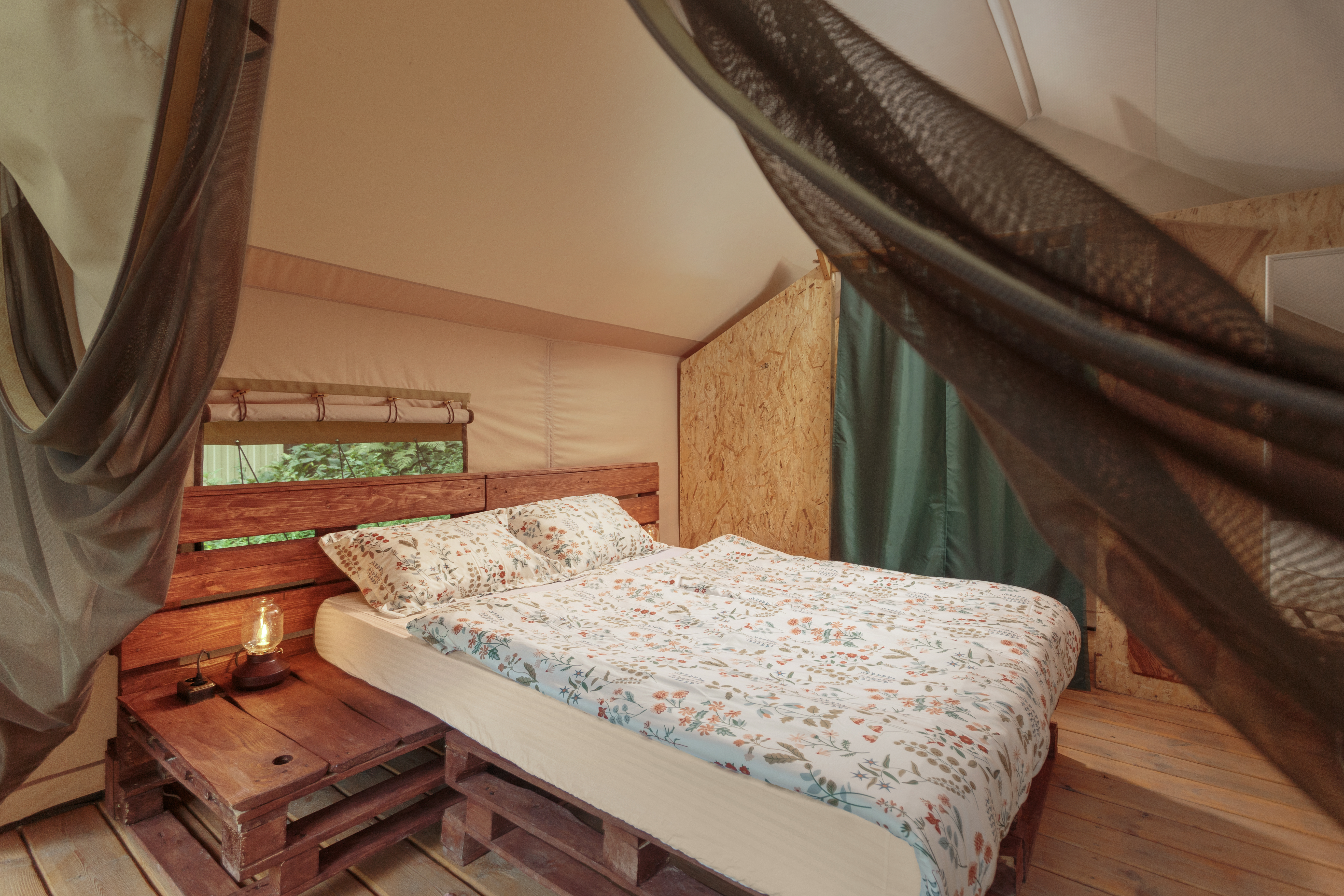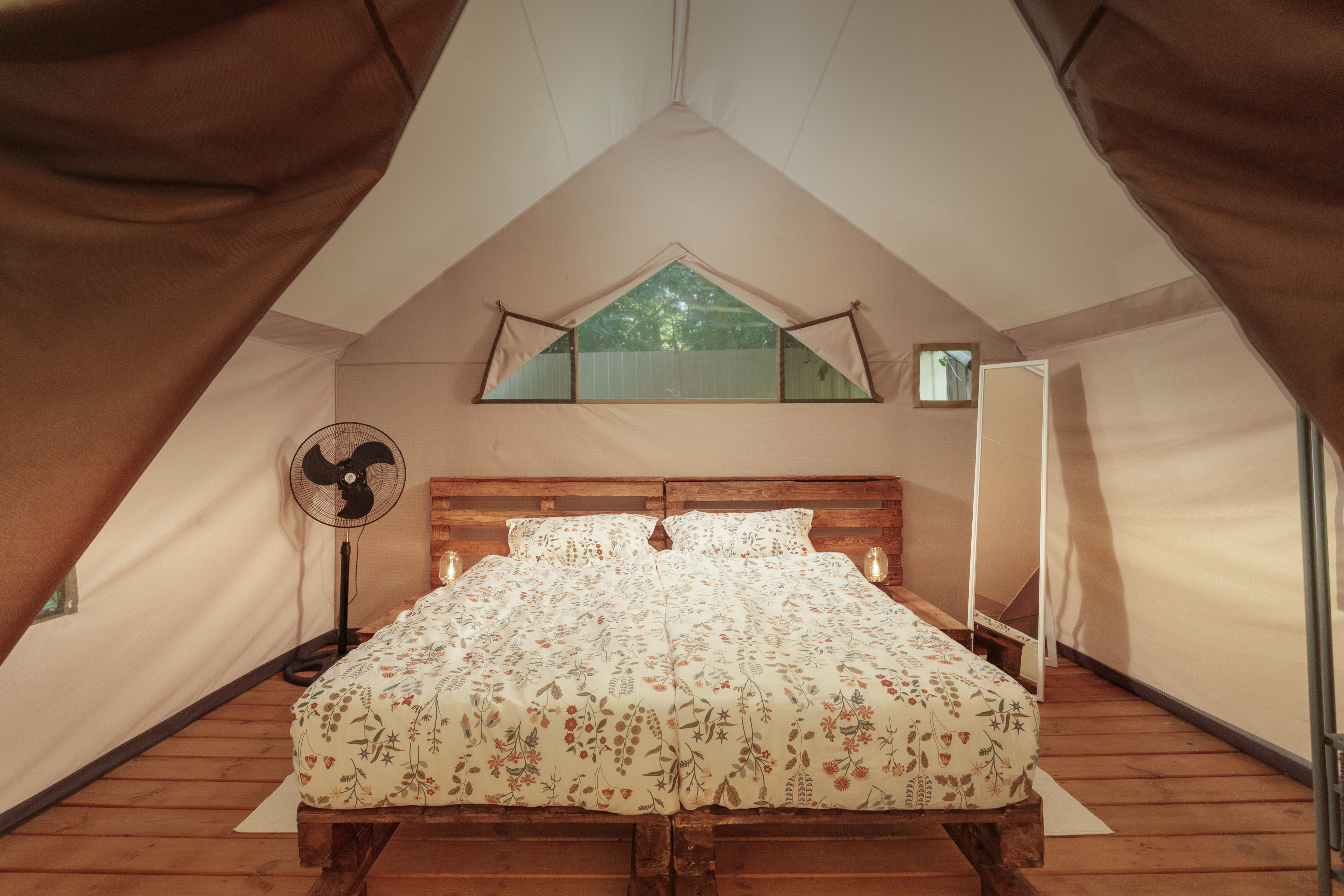Оснащение каждого тент хауса: двуспальная кровать king size, прикроватные тумбы, ночные лампы, зеркало, вентилятор.