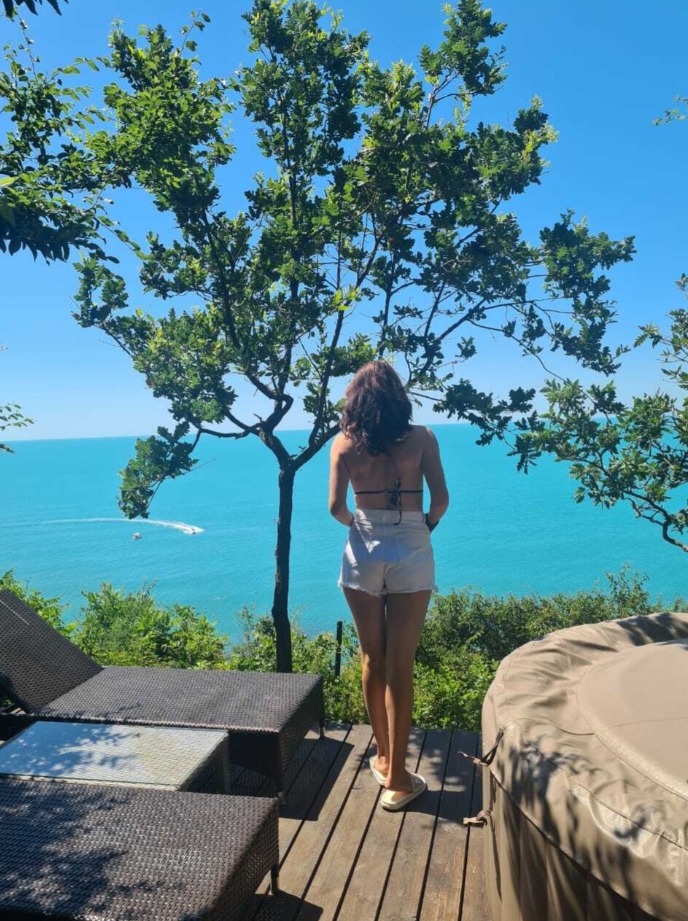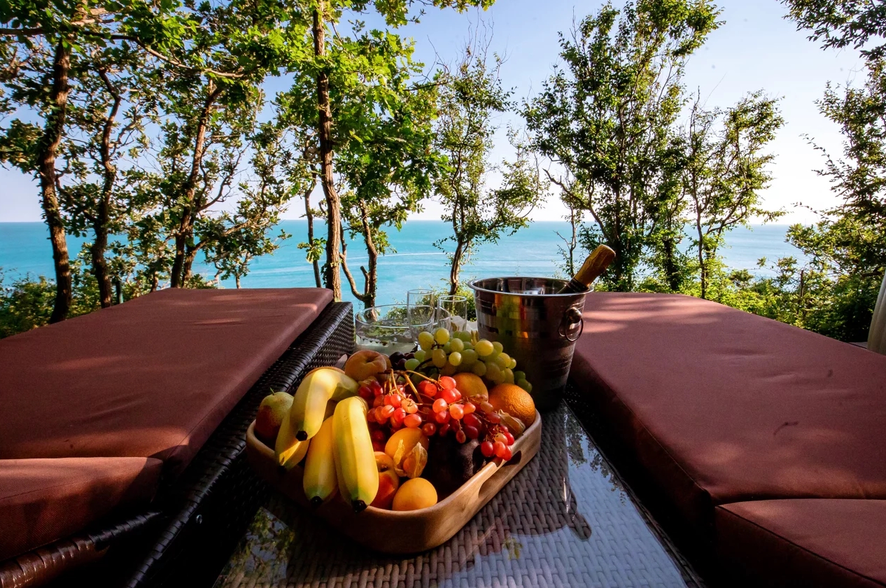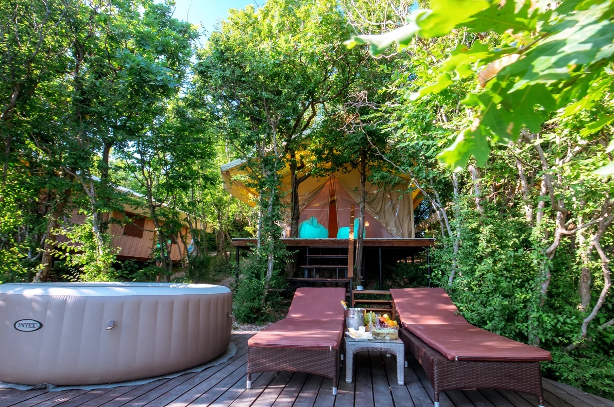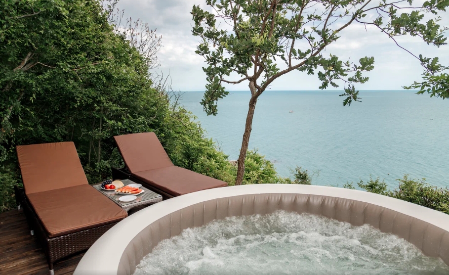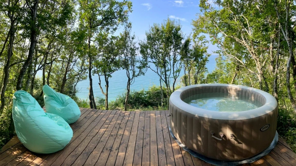 Каждый шатёр оснащен собственной террасой, с бассейном-джакузи и шезлонгами, откуда открывается великолепный вид на лазурное море и Прохоровский пляж.