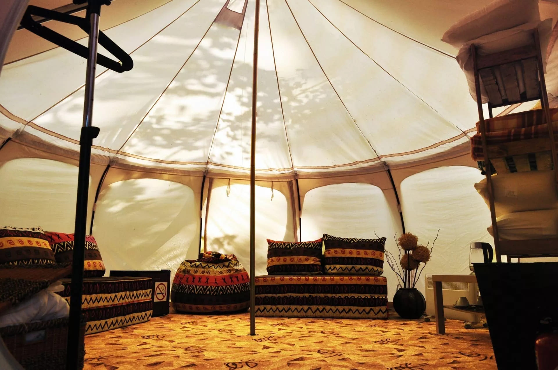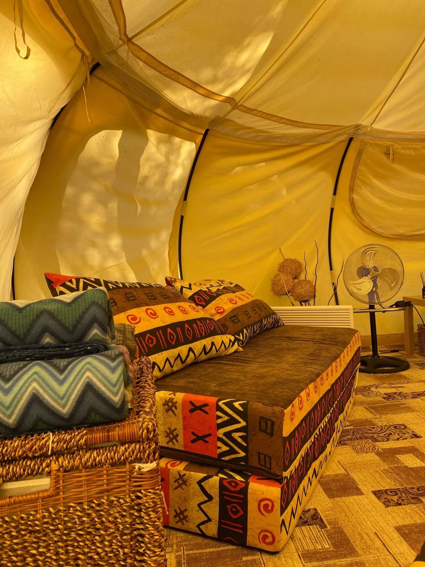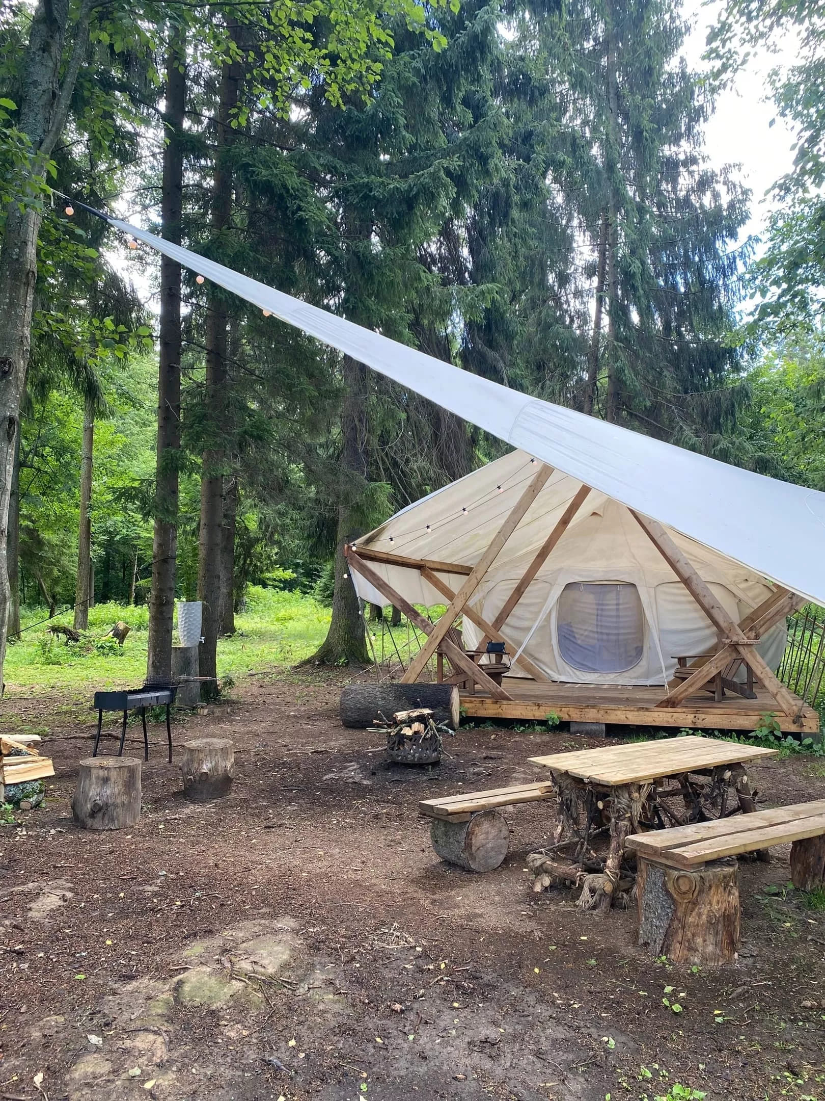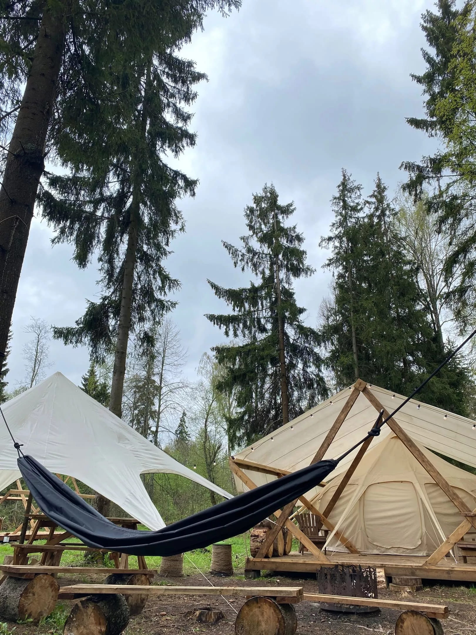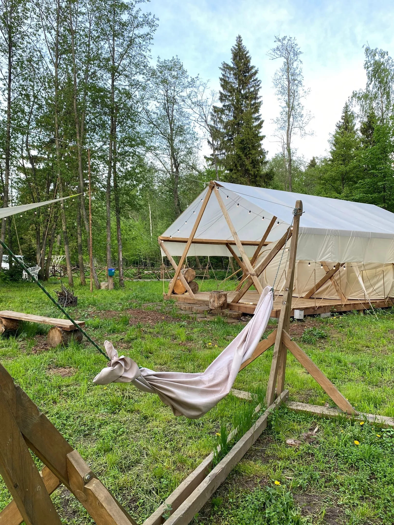 Уютные шатры типа Белл-тент под навесом. На территории вокруг шатра находятся большой стол, костровая зона, гамаки, качели.