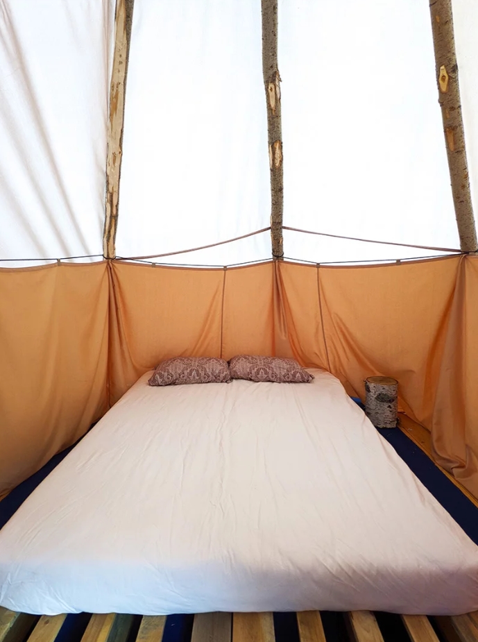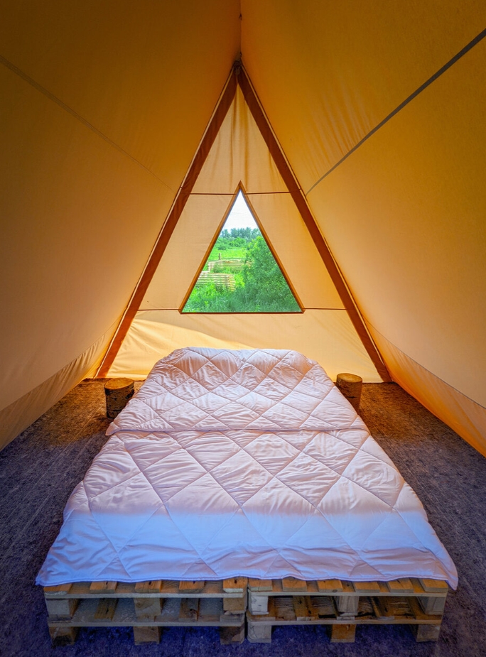 Наши палатки изготовлены из материала, отталкивающего солнечные лучи, поэтому в жаркие дни в них очень комфортно, а в прохладные вы сможете включить обогреватель. Если с вами ребёнок, то есть возможность добавить дополнительное спальное место.