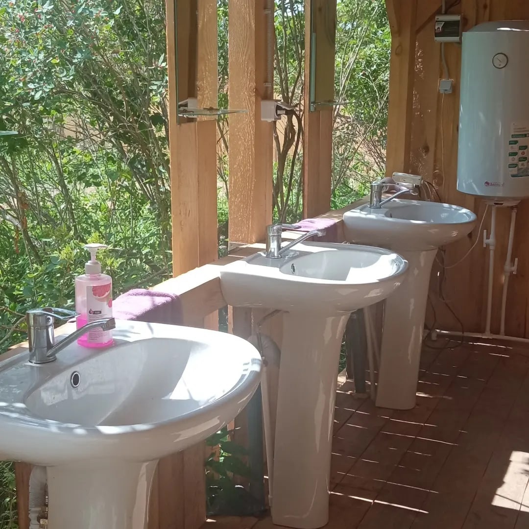 - Санузел с душем в шаговой доступности на территории глэмпинга