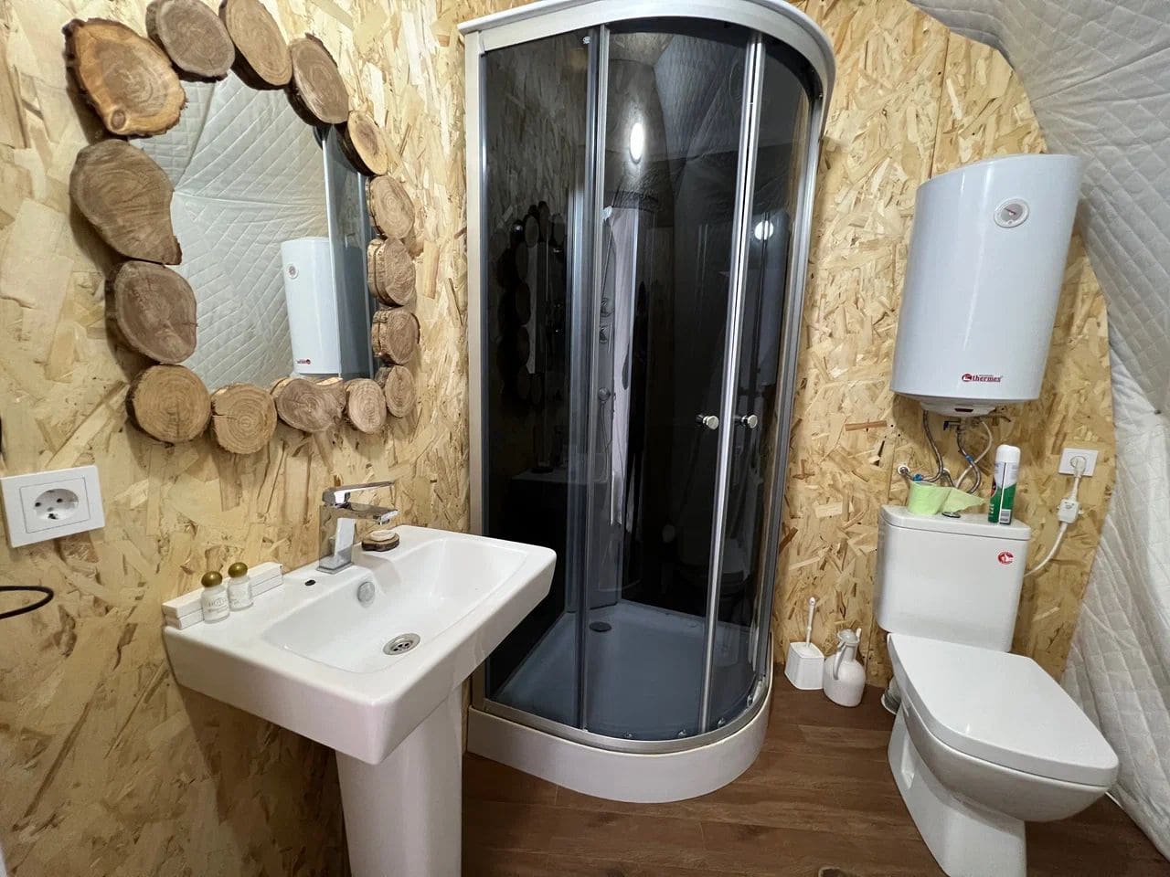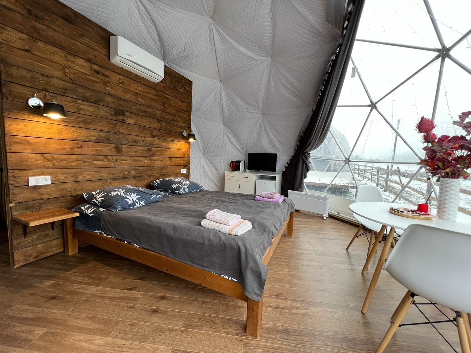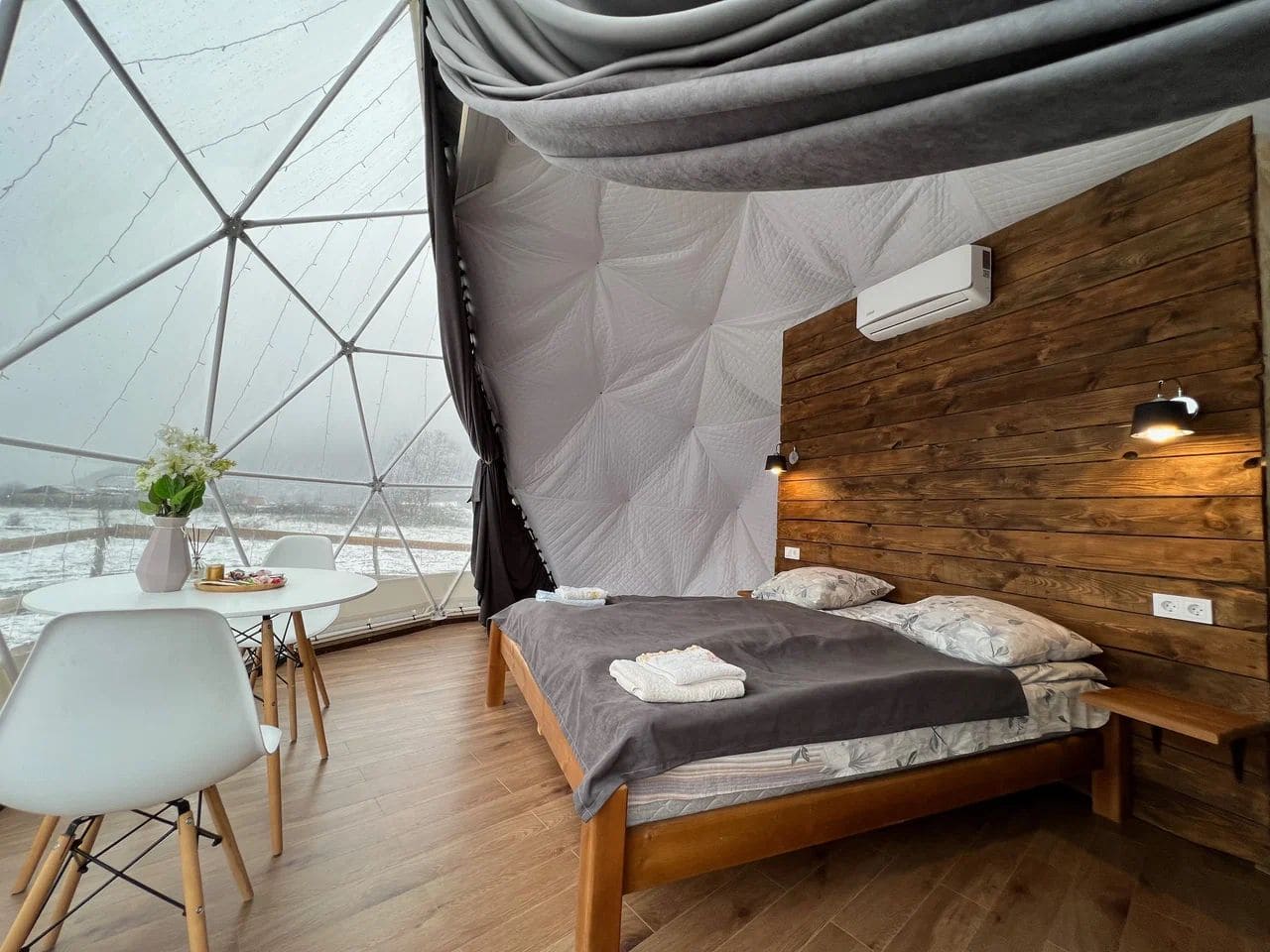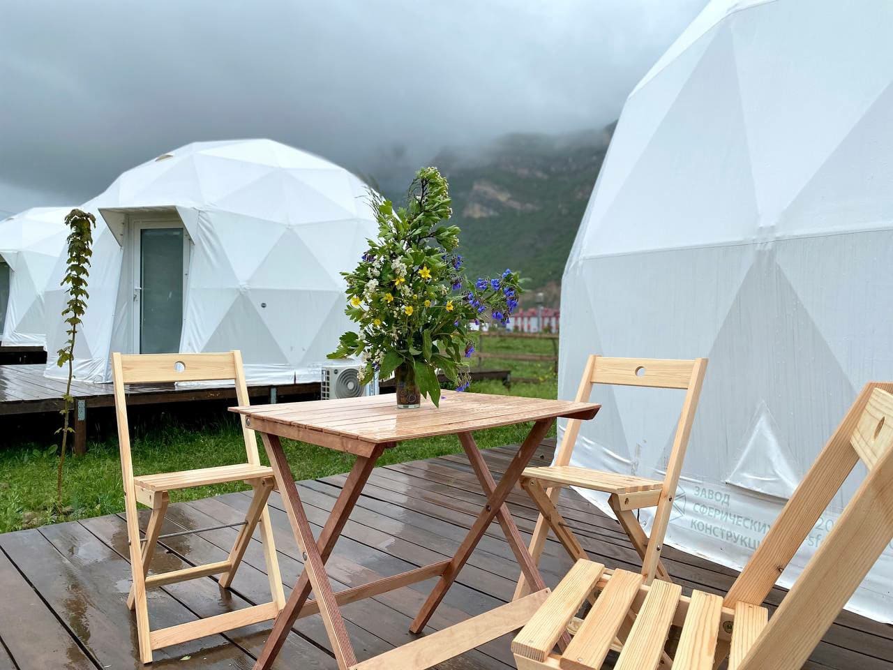 Глэмпинг Утро в горах состоит из уютных домиков в виде купола, каждый из которых оснащен всем необходимым для комфортного проживания.