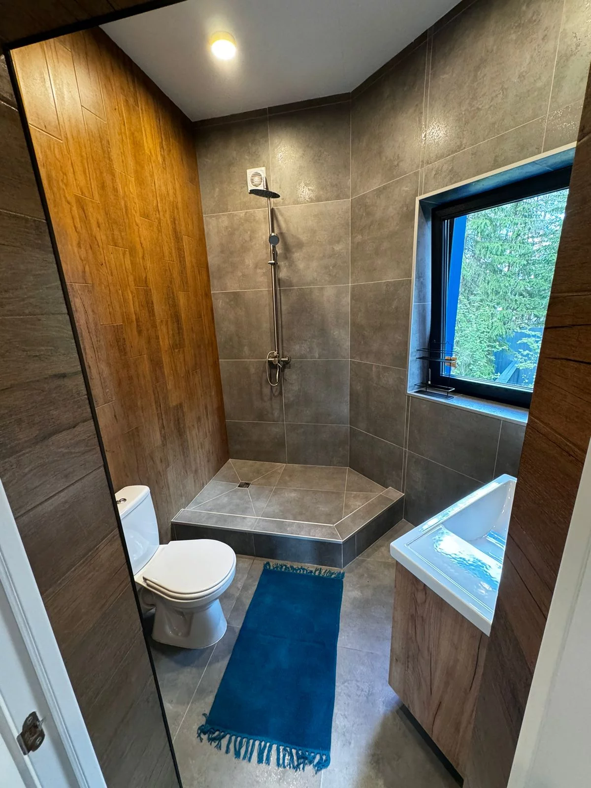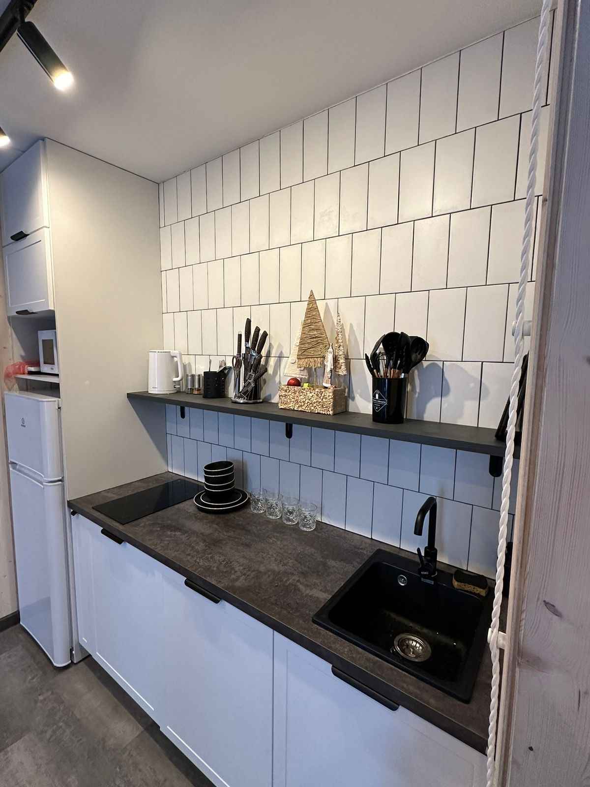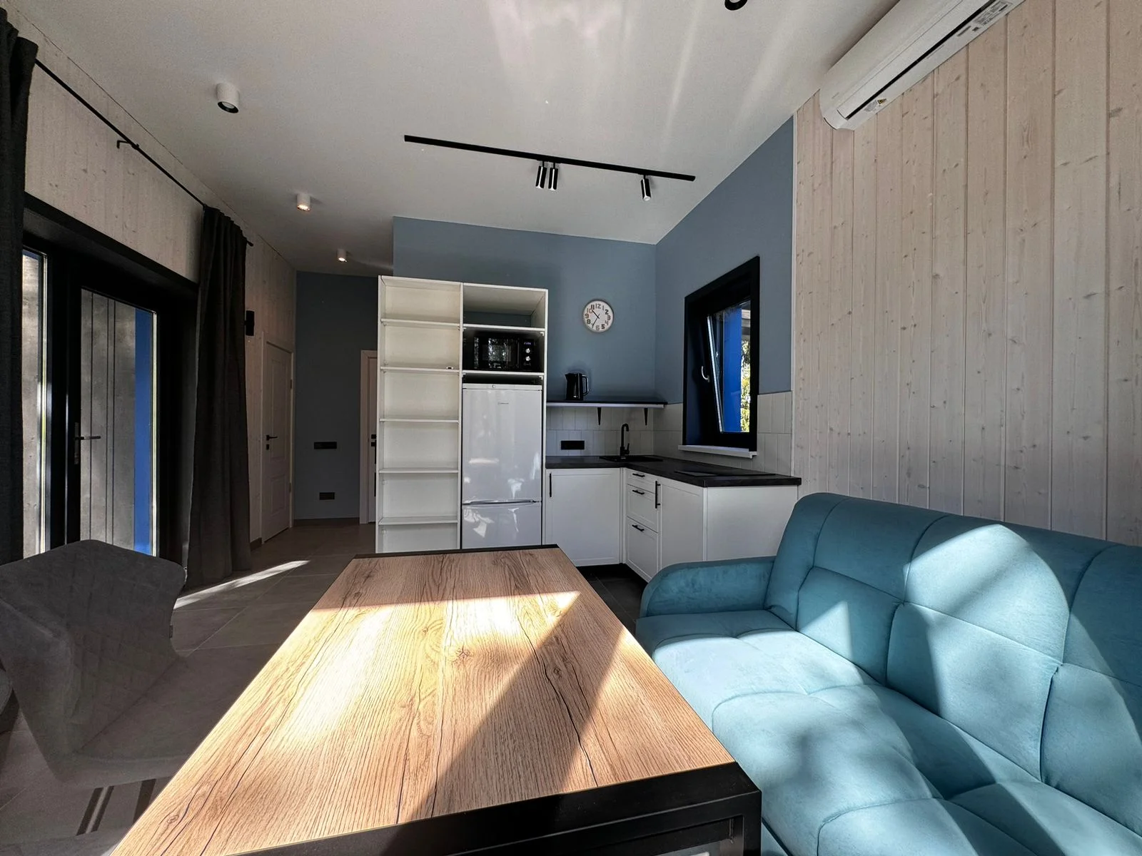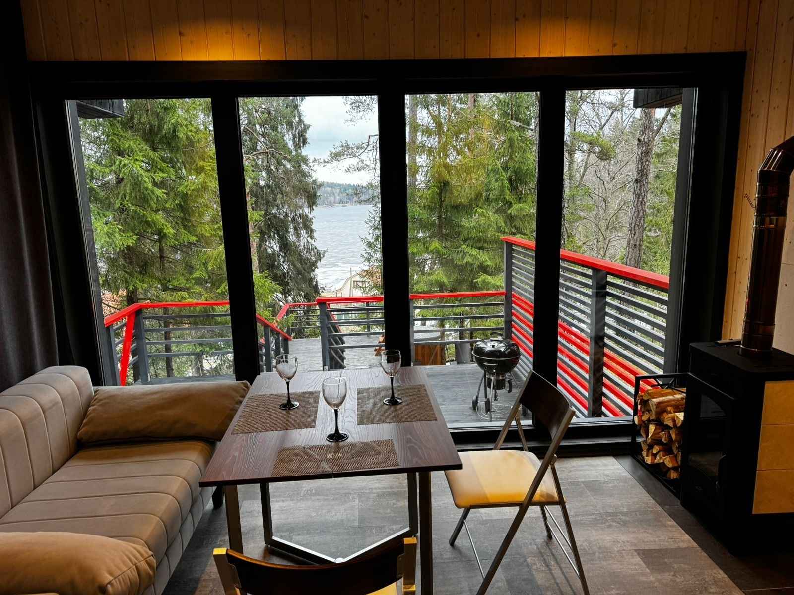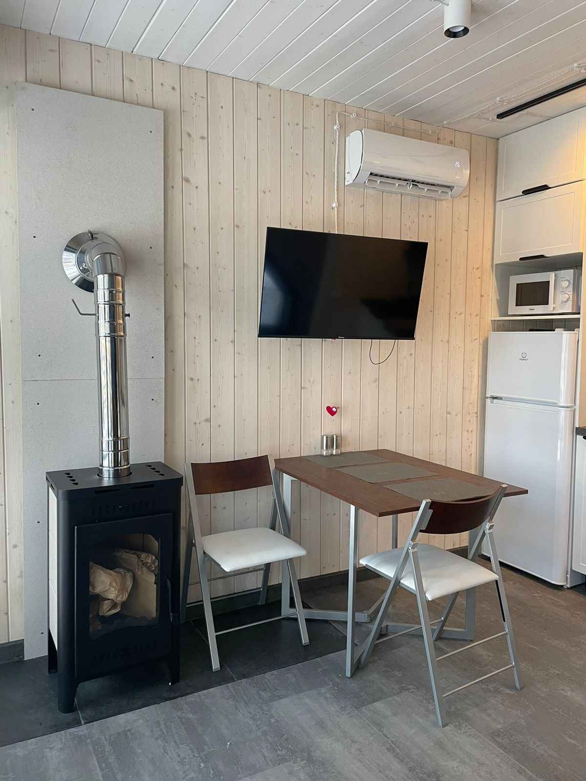 Домики оборудованы печкой камином, теплым полом, кондиционерами с функцией обогрева на каждом этаже, панорамными окнами, телевизором, холодильником, электроплитой, wi-fi роутером, и всем необходимым для приготовления пищи.