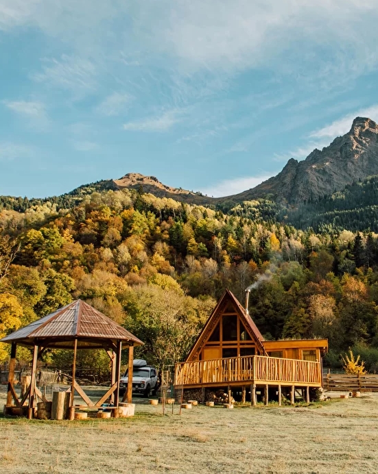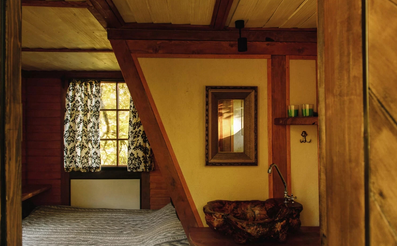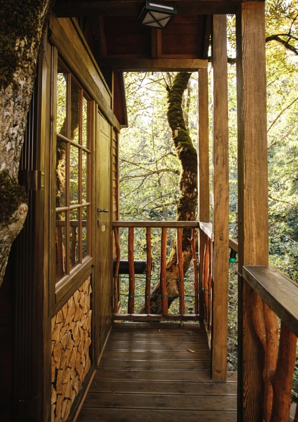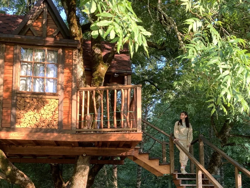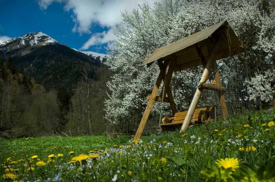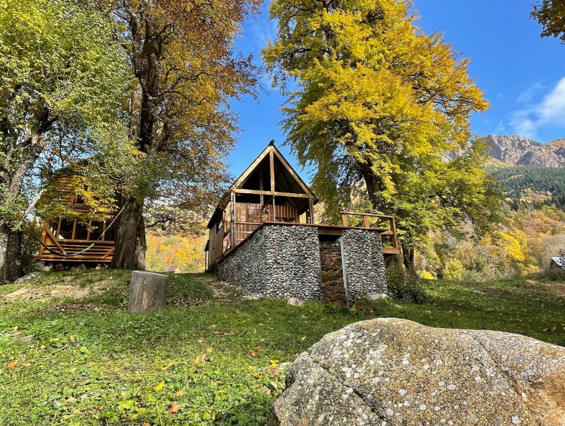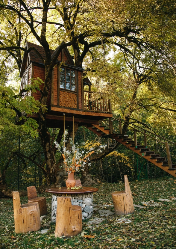 Домик построен на стволе ясеня на высоте 4 метра. С одной стороны от домика находится просторная поляна, с другой - берег горной реки. В домике есть водопровод, отопление и электричество, двухспальная кровать и балкон с видом на горы. Под кроной дерева находится обеденная зона и подвесные качели.