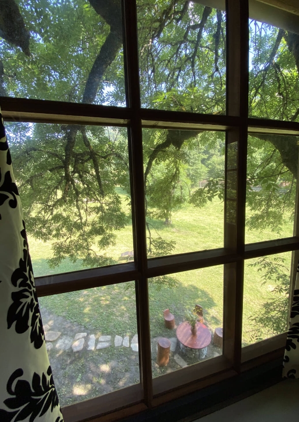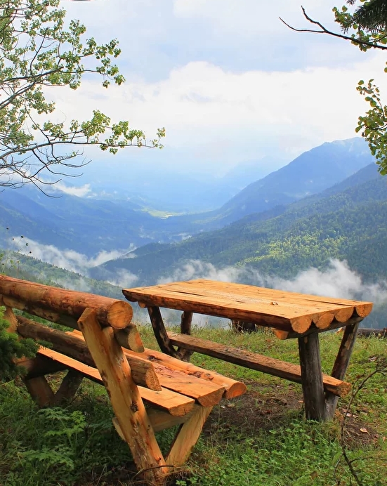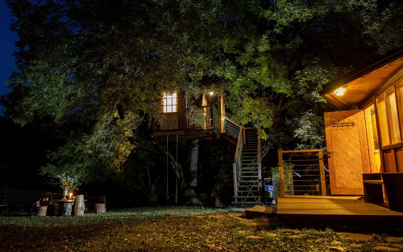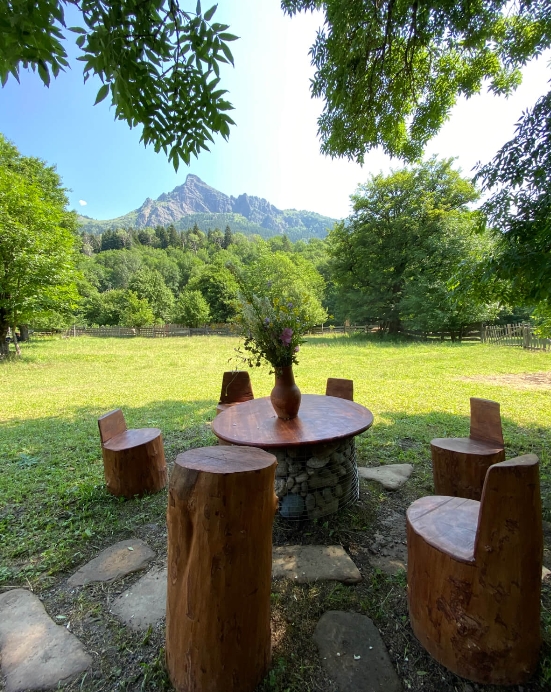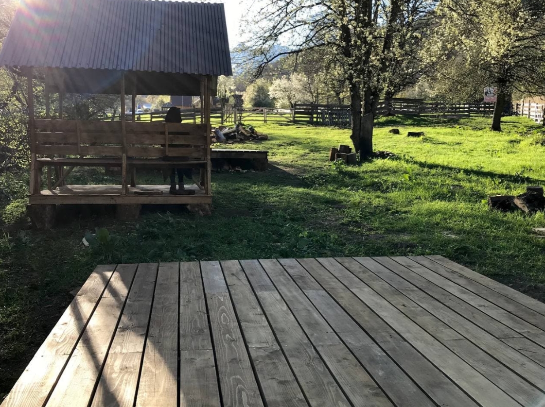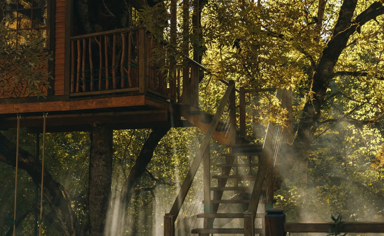 Домик построен на стволе ясеня на высоте 4 метра. С одной стороны от домика находится просторная поляна, с другой - берег горной реки. В домике есть водопровод, отопление и электричество, двухспальная кровать и балкон с видом на горы. Под кроной дерева находится обеденная зона и подвесные качели.