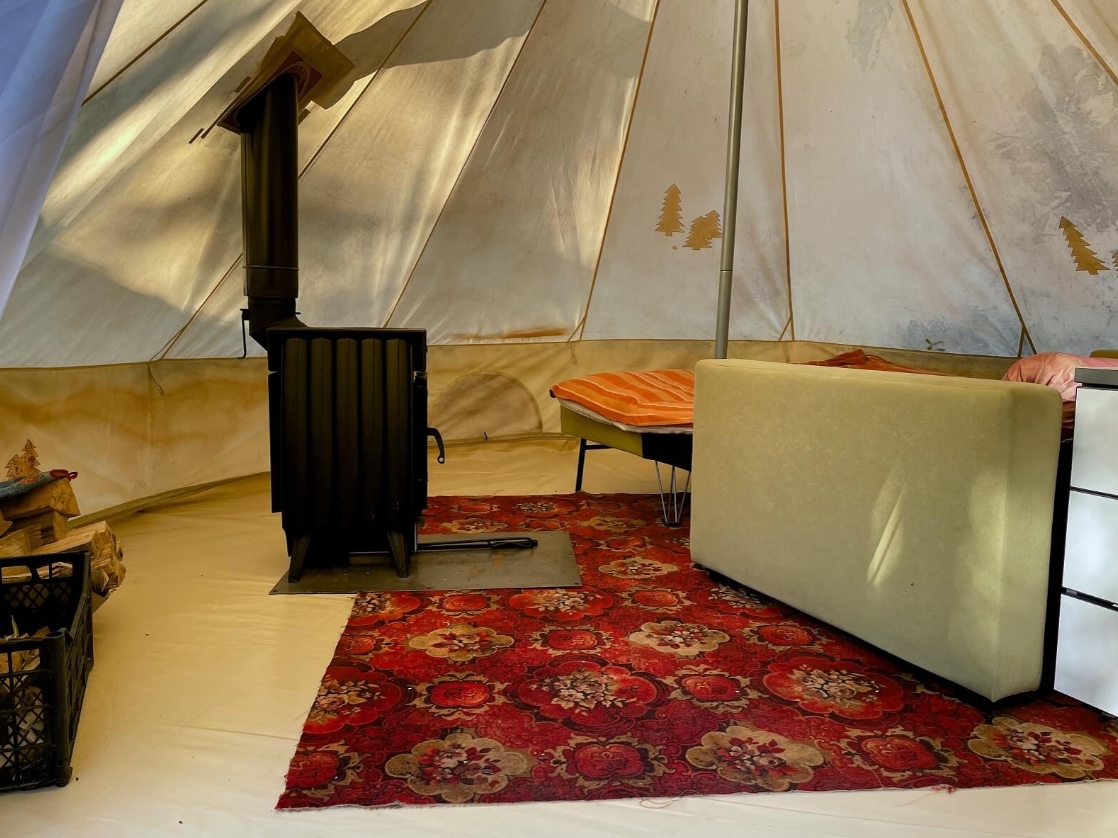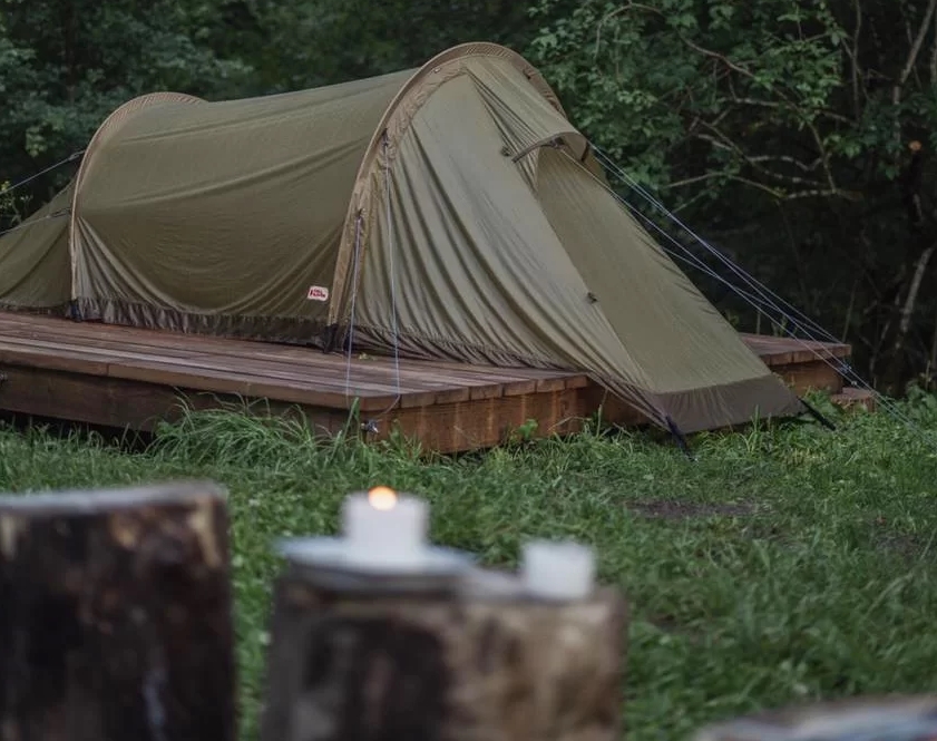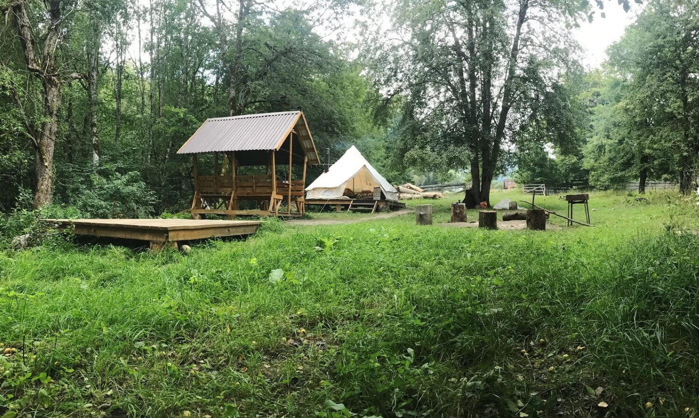 В вашем распоряжении - 2 деревянные площадки (4х4 и 3х3 м.) на одной из которых расположен шатёр с печкой, двуспальным диваном (без постельного белья) и тумбочкой. Беседка с освещением, оборудованное место для приготовления пищи и разведения костра. Имеется водопровод и туалет, природный холодильник.