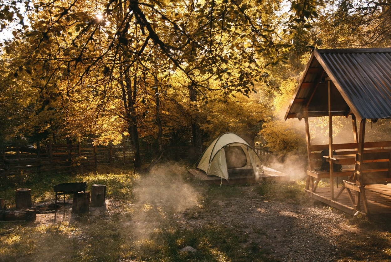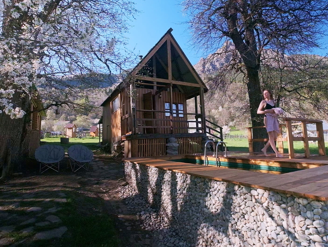 В глэмпинге расположены: современный альпийский домик, двухэтажный сруб у реки, домик на дереве, финские домики, шатёр-кемпинг, баня с бассейном и сибирский чан.