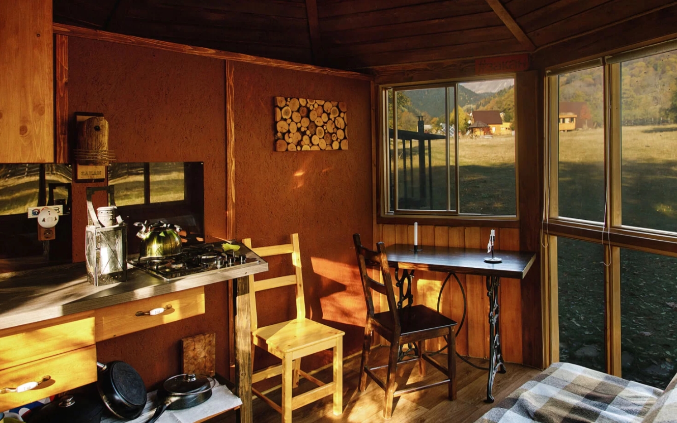 На земле, рядом с домом, стоит утепленная кухня с панорамным остеклением, камином и горячей водой. На кухне есть возможность разместить 2 гостей на раскладном "диване-полуторке". Во время отдыха гости могут использовать мангал с навесом и шезлонг.
