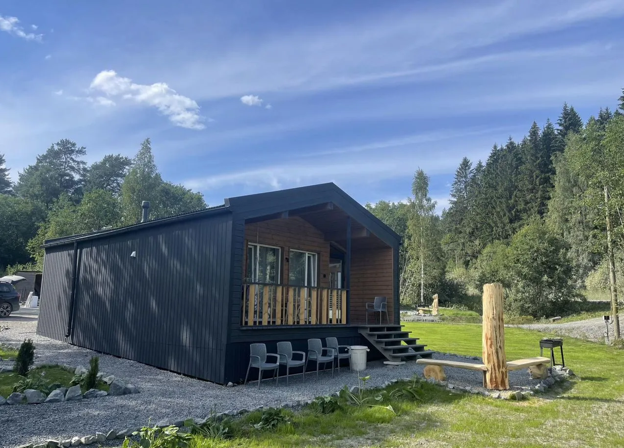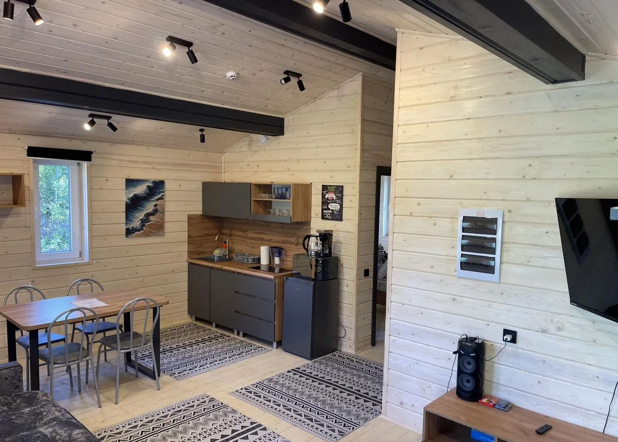 Площадь коттеджа — 50 кв. м + терраса. Внутреннее пространство включает просторную кухню-гостиную с диваном-кроватью, две отдельные спальни с двуспальными кроватями, ванную комнату с полным набором принадлежностей, а также мангальную зону с шампурами. Дом рассчитан на комфортное размещение до 5 человек: в спальнях — две кровати, в кухне-гостиной — раскладной диван на 2 спальных места.