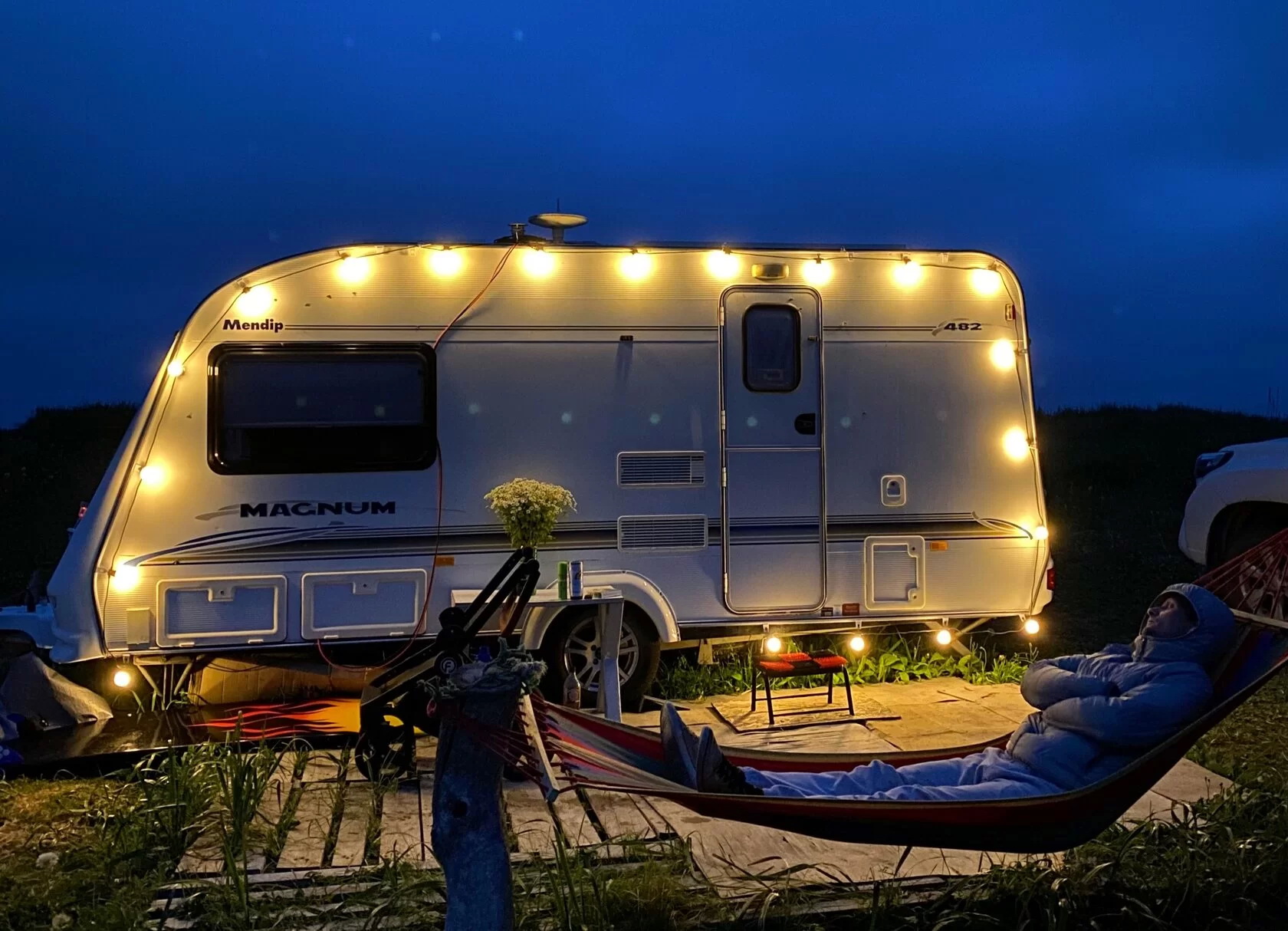 Территория перед кемперами оборудована площадкой из обработанного деревянного настила, освещением, креслами.