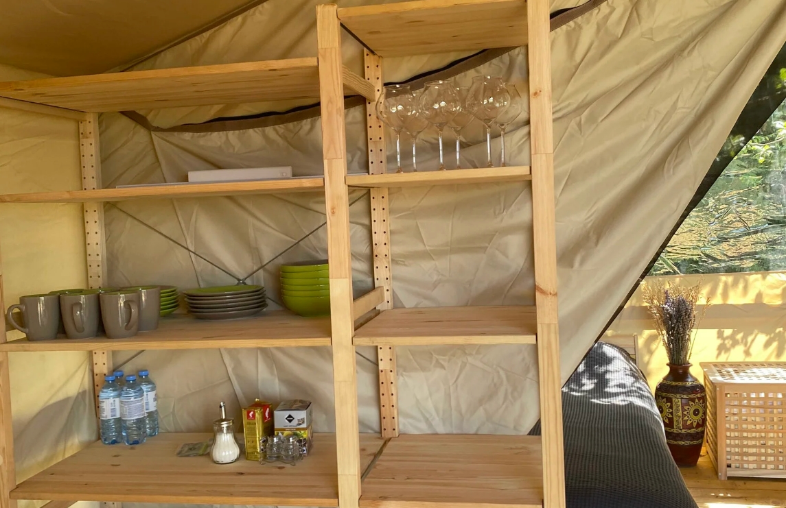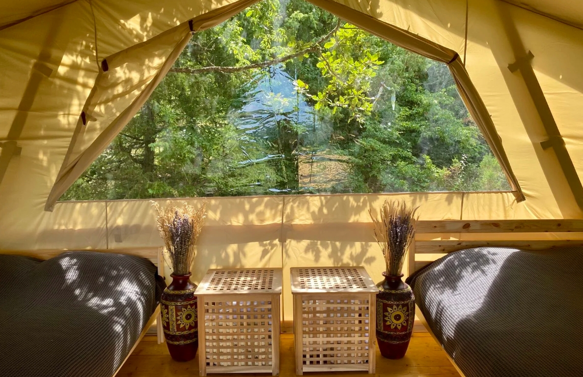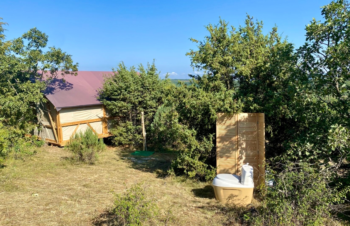 Глемпинг с видом на виноградник, море и горы. Расположен среди можжевельника.