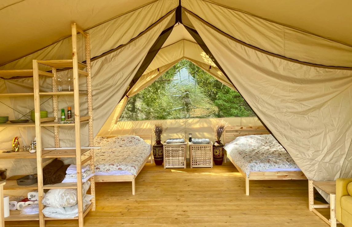 Ночью температура в глемпинге чуть теплее, чем на улице. Но мы позаботились о вашем комфорте: двойные пуховые одеяла обеспечат тепло и уют!