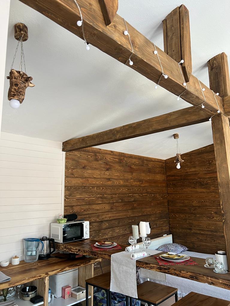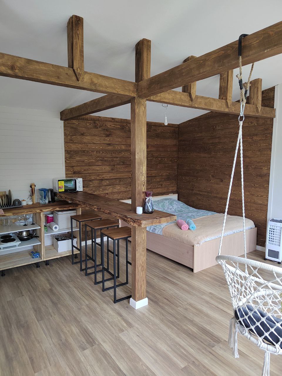 - зоная отдыха с проектором, колонкой алиса, паровым камином, креслом качелей, дизайнерской кроватью ручной работы из ценных пород дерева, качественным матрасом, свечами и подсветкой для романтического вечера (свет управляется алисой , его можно регулировать от тусклого до яркого и разноцветного), отличным wifi, халаты, тапочки;