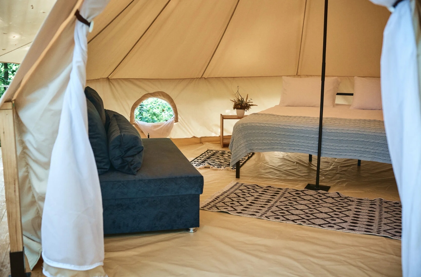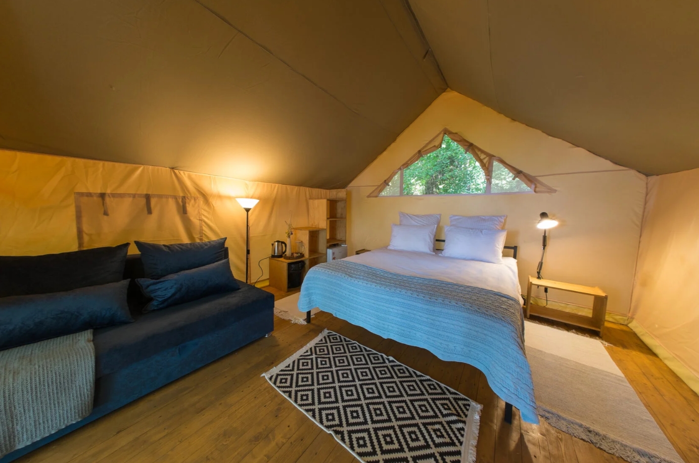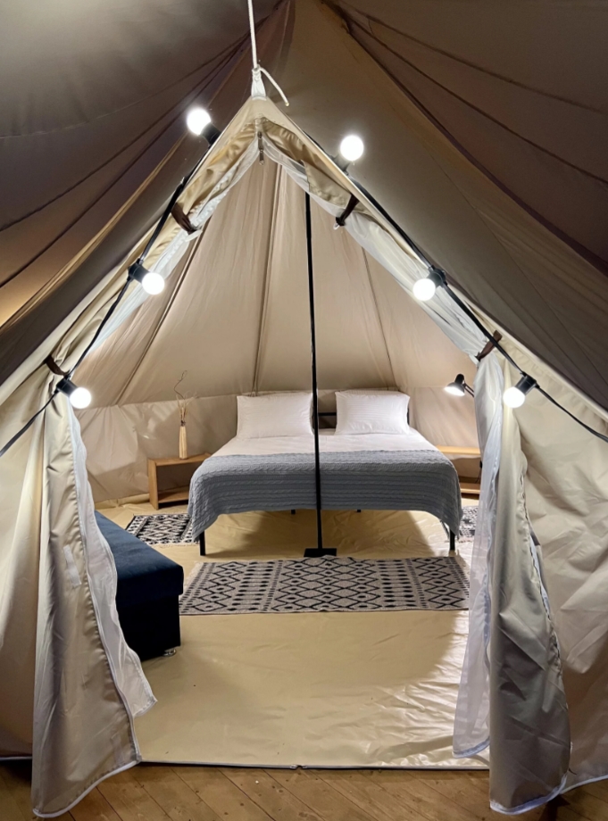 Кэмпы укомплектованы всем необходимым, а именно: постельное бельё, пледы для вечера, вентилятор, чай, кофе, сахар, мини холодильник, набор посуды, одноразовые тапочки и даже фумигатор от Комаров.