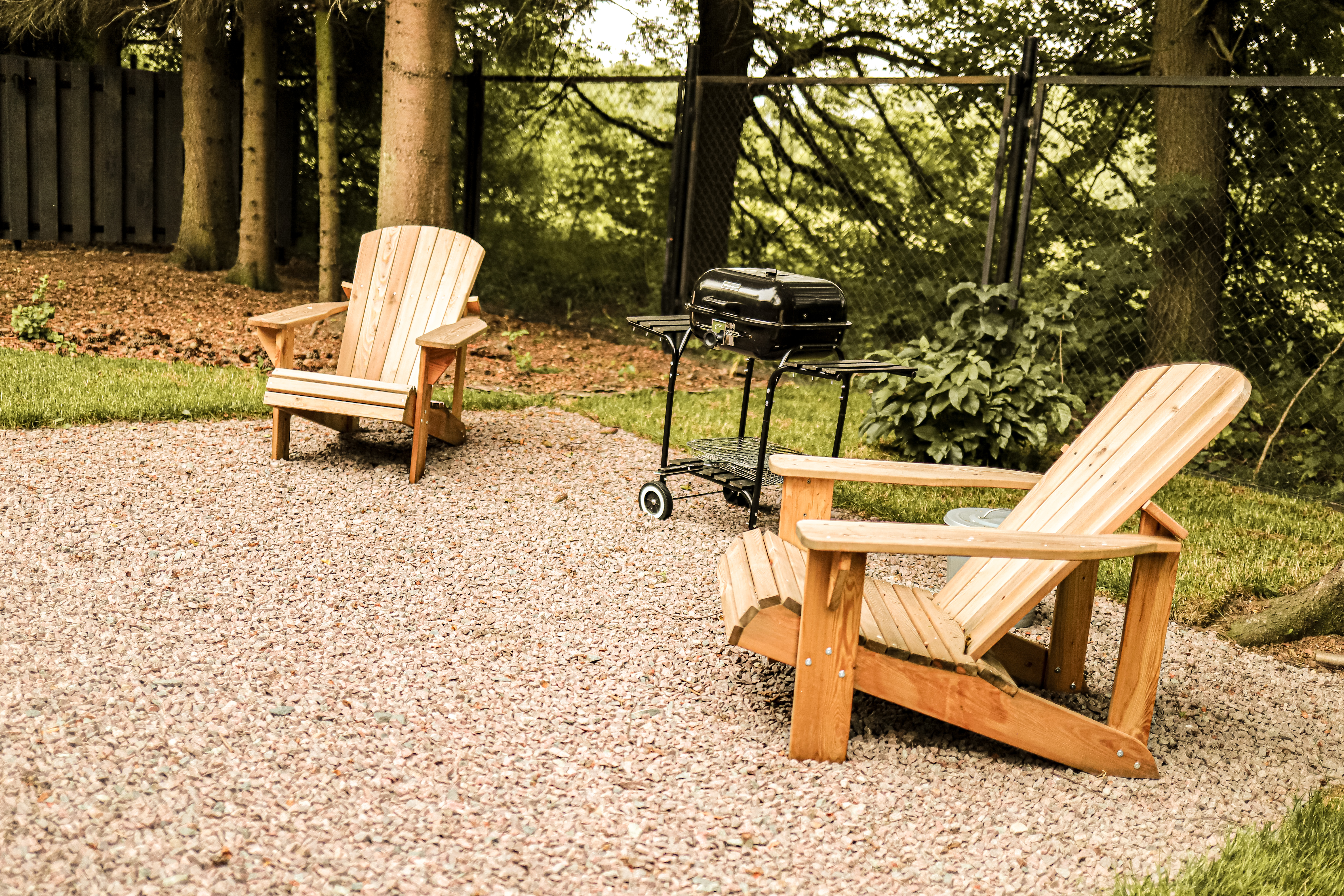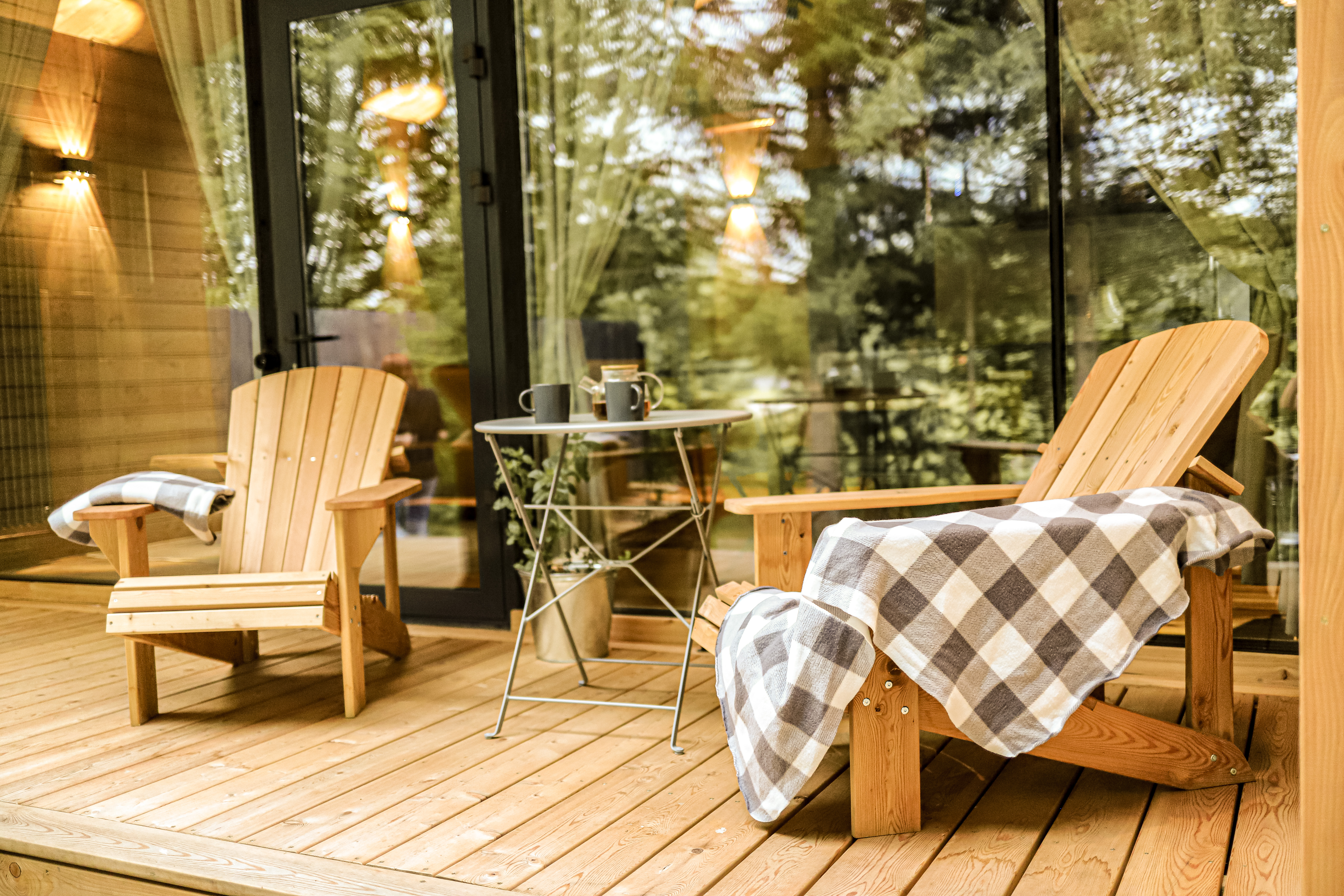 Веранда с шезлонгами, уютное место для отдыха на свежем воздухе и зона барбекю.