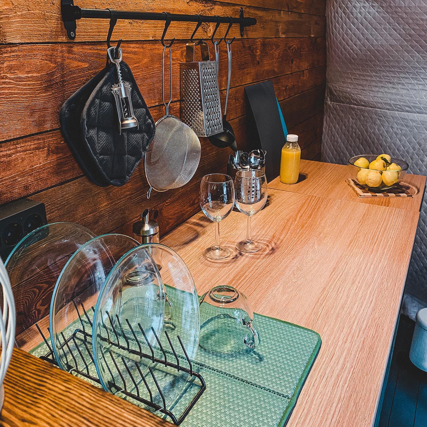 — мини-кухня с раковиной и набором посуды на 3-х человек (включая для приготовления пищи):