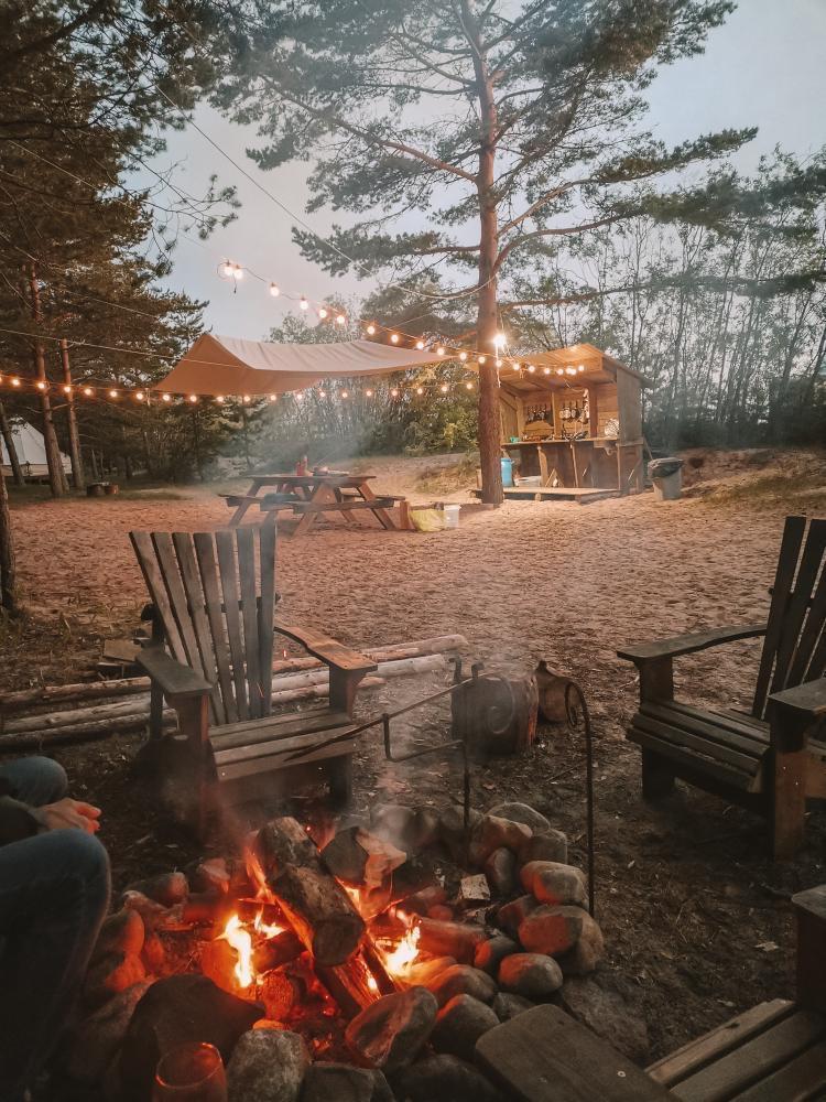 В нашем глэмпинге имеется несколько костровых зон, где можно разводить костры. Они оборудованы удобными стульями адирондак и столами для большой компании!